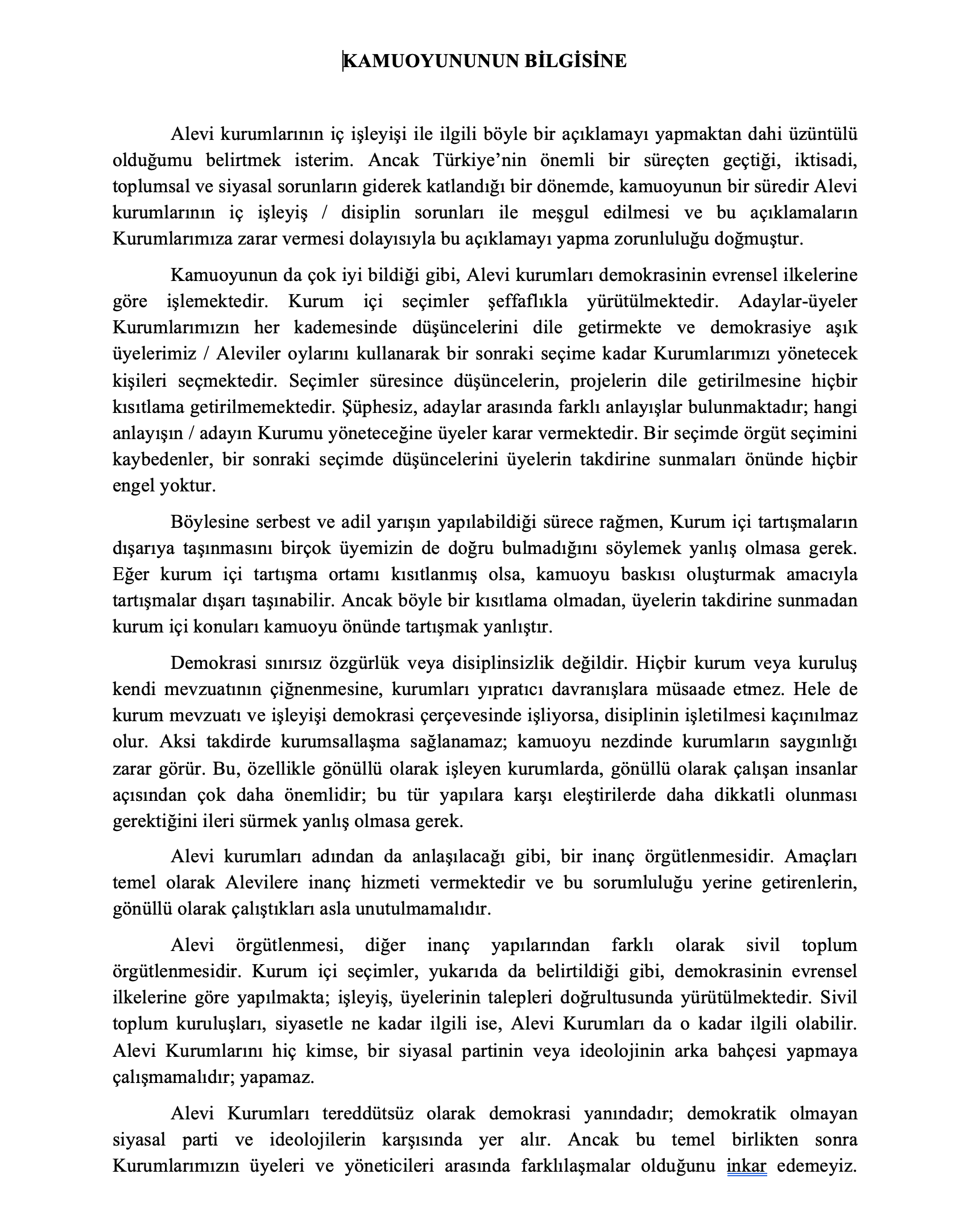 “Alevi kurumlarının iç işleyişi ile ilgili böyle bir açıklamayı yapmaktan dahi üzüntülü olduğumu belirtmek isterim. Ancak Türkiye’nin önemli bir süreçten geçtiği, iktisadi, toplumsal ve siyasal sorunların giderek katlandığı bir dönemde, kamuoyunun bir süredir Alevi kurumlarının iç işleyiş/disiplin sorunları ile meşgul edilmesi ve bu açıklamaların kurumlarımıza zarar vermesi dolayısıyla bu açıklamayı yapma zorunluluğu doğmuştur.