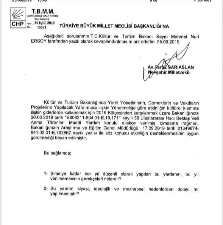 Kültür Bakanlığı Araştırma ve Eğitim Genel Müdürlüğü’nün Nevşehir Valiliği İl Kültür ve Turizm Müdürlüğü’ne gönderdiği resmi yazıda, Hacı Bektaş Veli Anma Etkinlikleri için yapılan yardım talebinin uygun görülmediği belirtildi.