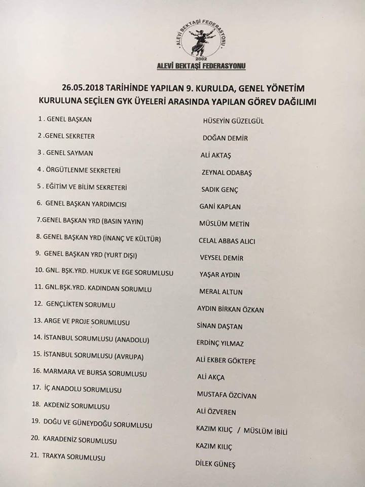 Yapılan görevlendirmede Genel Başkan Hüseyin Güzelgül, Genel Sekreter Doğan Demir, Genel Sayman Ali Aktaş, Örgütlenme Sekreteri Zeynal Odabaş, Eğitim ve Bilim Sekreteri Sadık Genç, Genel Başkan Yardımcısı Gani Kaplan, Genel Başkan Yardımcısı (basın yayın) Müslüm Metin, Genel Başkan Yardımcısı (inanç ve kültür) Celal Abbas Alıcı, Genel Başkan Yardımcısı (yurt dışı) Veysel Demir getirildi.