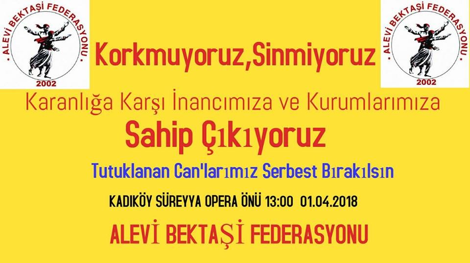 Yarın Pir Sultan Abdal Kültür Derneği’nin İstanbul’daki tüm şubelerinde eş zamanlı saat: 19.00’da basın açıklamaları gerçekleşecek. 1 Nisan günü saat: 13.00’de ise İstanbul Kadıköy Süreyya Operası önünde bir araya gelecek olan Alevi Bektaşi Federasyonu üyeleri, “Korkmuyoruz, sinmiyoruz. Karanlığa karşı inancımıza ve kurumlarımıza sahip çıkıyoruz. Tutuklanan canlarımız serbest bırakılsın” diyecek. (HABER MERKEZİ)