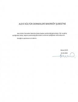 “Alevi Kültür Derneği Bakırköy Şubesi’ndeki başkan yardımcılığı görevimden, dernek lokal açılışımıza karşı çıkmama rağmen ve haberim olmadan dernek başkanımız tarafından Bakırköy İlçe Müftüsü’nün çağrılmasından dolayı istifa ettiğimi tüm Alevi kamuoyuna bildiririm.”