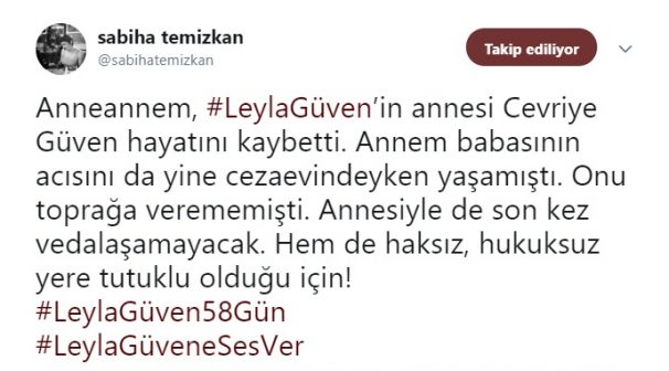 Leyla Güven’in gazeteci olan kızı Sabiha Temizkan, Twitter’dan yaptığı açıklamada “Anneannem, Leyla Güven’in annesi Cevriye Güven hayatını kaybetti. Annem babasının acısını da yine cezaevindeyken yaşamıştı. Onu toprağa verememişti. Annesiyle de son kez vedalaşamayacak. Hem de haksız, hukuksuz yere tutuklu olduğu için” dedi.