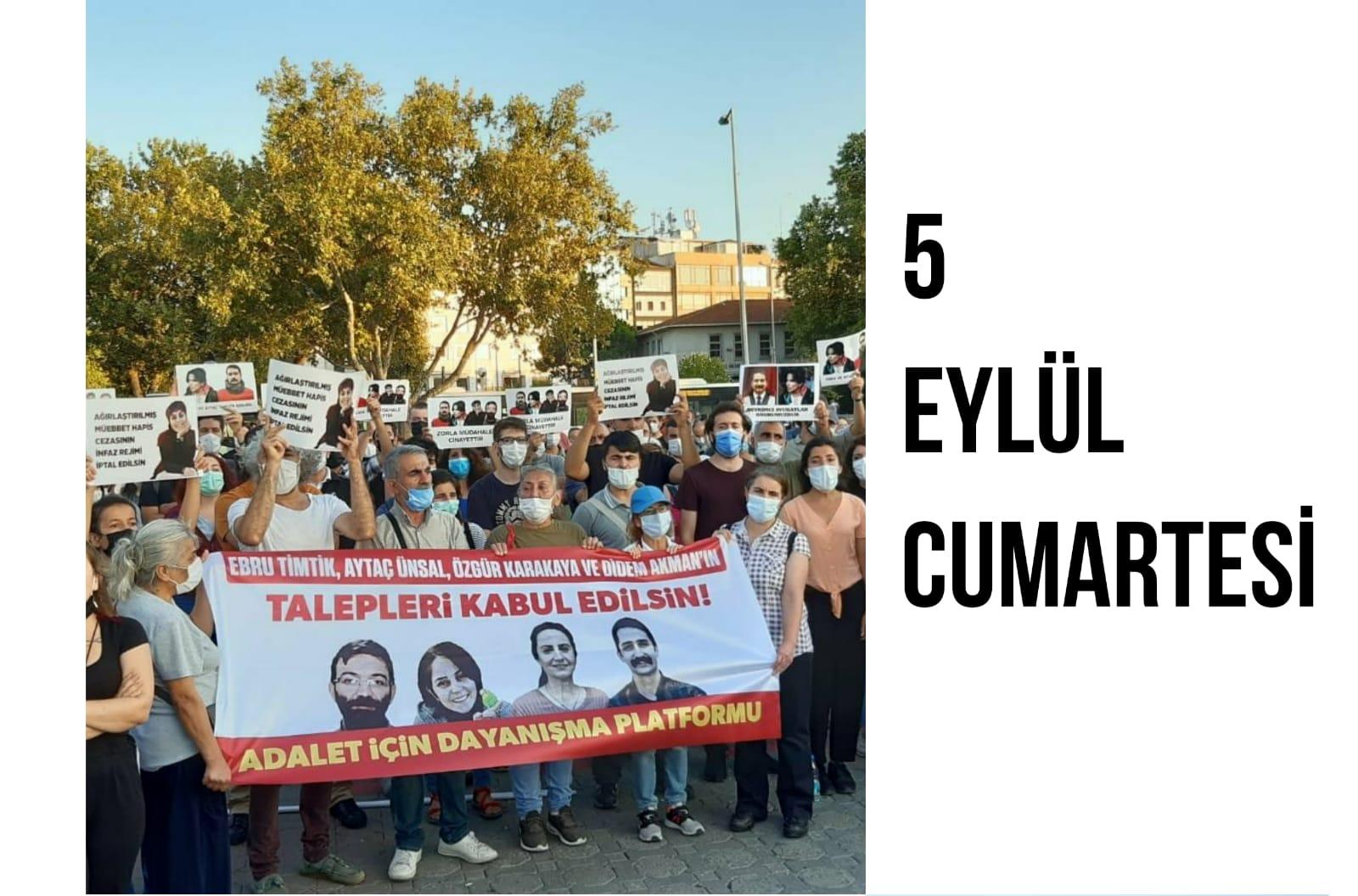 5 Eylül Cumartesi günü Kadıköy İskele Meydanı’nda yapacakları açıklamaya çağrıda bulunan platform, “5 Eylül Cumartesi Saat 15.00’de Kadıköy İskele Meydanı’nda Aytaç, Özgür ve Didem’in taleplerinin kabul edilmesi için bir araya geleceğiz. Tüm devrimci-demokrat kurumları ve halkımızı dayanışmaya davet ediyoruz. EBRU TİMTİK ÖLÜMSÜZDÜR! AYTAÇ’I, ÖZGÜR’Ü, DİDEM’İ YAŞATALIM!” ifadelerine yer verdi. PİRHA/İSTANBUL