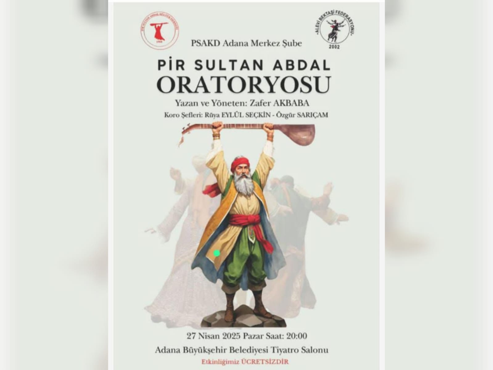 Pir Sultan Abdal Kültür Derneği (PSAKD) Adana Merkez Şubesi, 27 Nisan Pazar günü saat 20.00’de Adana Büyükşehir Belediyesi Tiyatro Salonu’nda Pir Sultan Abdal Oratoryosu düzenleyecek.