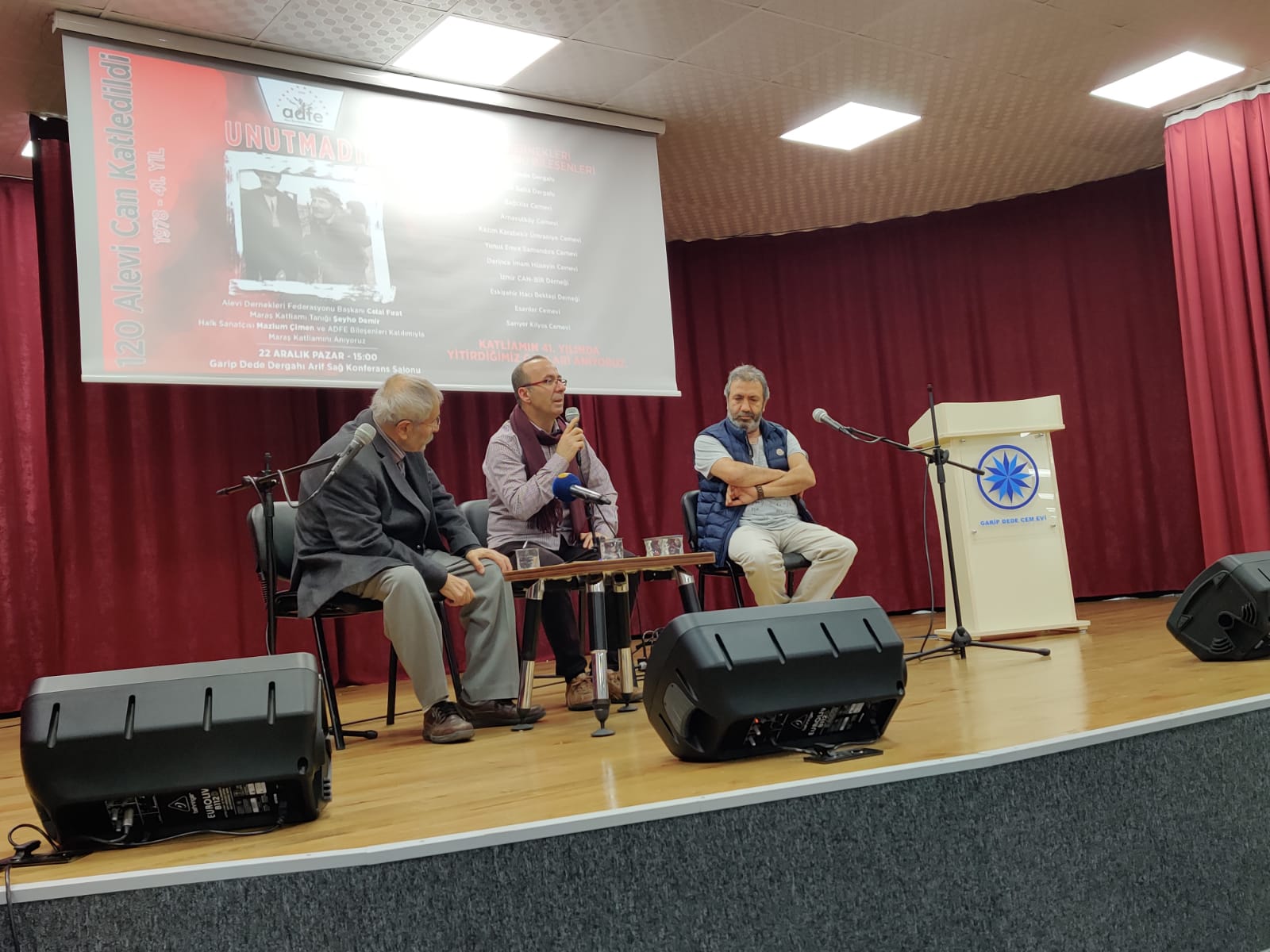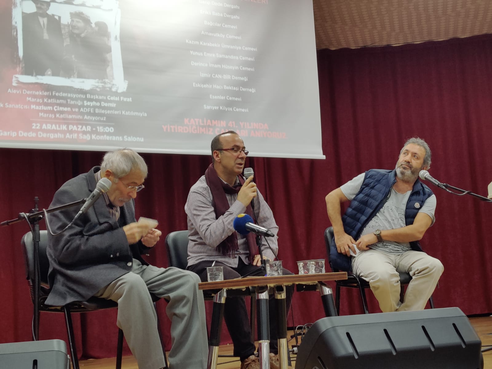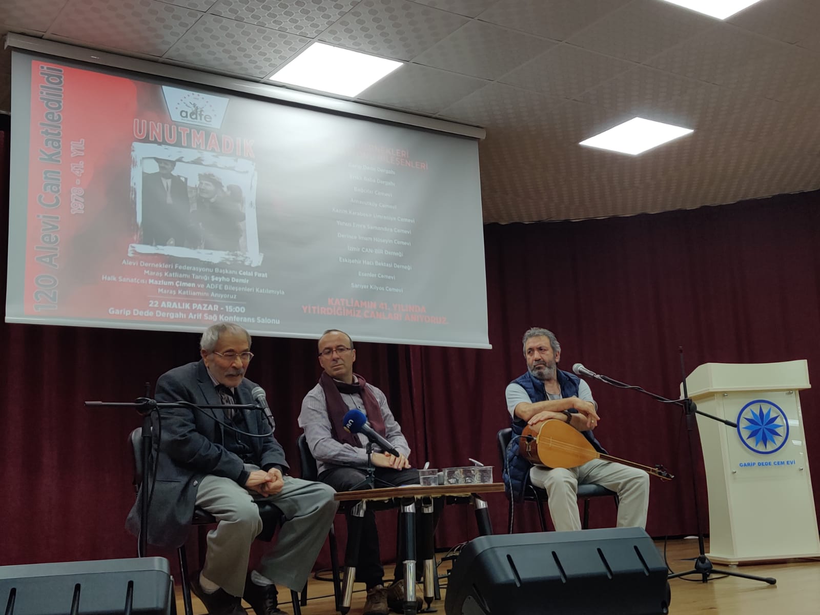 Garip Dede Cem Evi’nde gerçekleşen anma ADFE Genel Başkanı ve Garip Dede Dergahı Başkanı Celal Fırat’ın açılış konuşması ile başladı. Maraş Katliamı tanıklarından Seyho Demir ile halk Sanatçısı Mazlum Çimen’in konuk olduğu programın moderatörlüğünü Veli Büyükşahin Dede yaptı. Celal Fırat “Aleviler olarak bu kara günleri anıyoruz. Hatırlatıyoruz. Katledilen canlarımızı anıyorum. Aleviler olarak 41 yıldır hesap soruyoruz, sormaya devam edeceğiz” dedi.