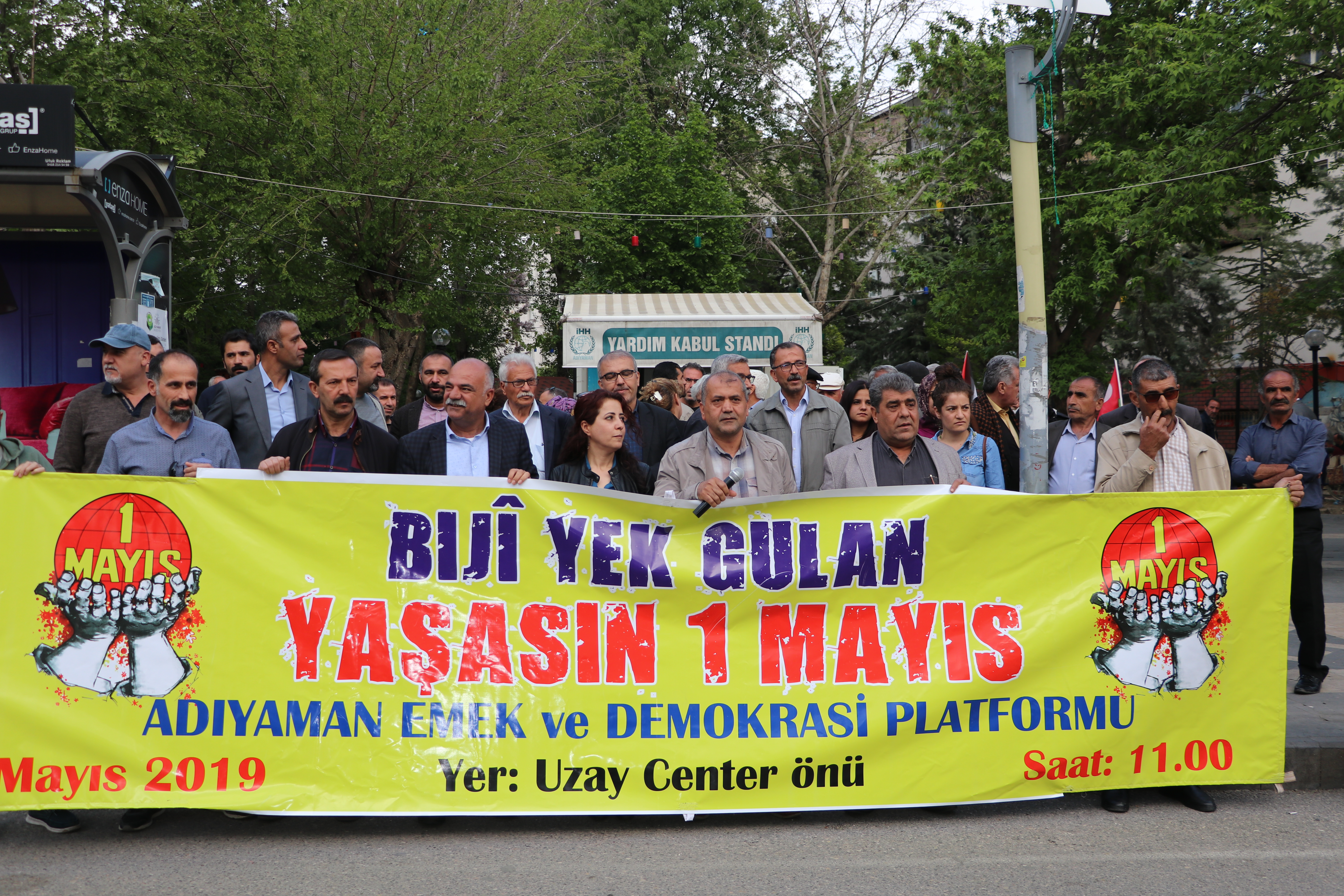 Adıyaman’da 1 Mayıs İşçi ve Emekçi bayramı hazırlıklarını sürdüren Emek ve Demokrasi Platformu bileşenleri Demokrasi Parkında bir araya gelerek Kürtçe ve Türkçe yazılı “Yaşasın 1 Mayıs” pankartı açtı. Sık sık “Biji yek Gûlan”, “Yaşasın 1 Mayıs” sloganları atan kitle basın açıklaması yaptı.