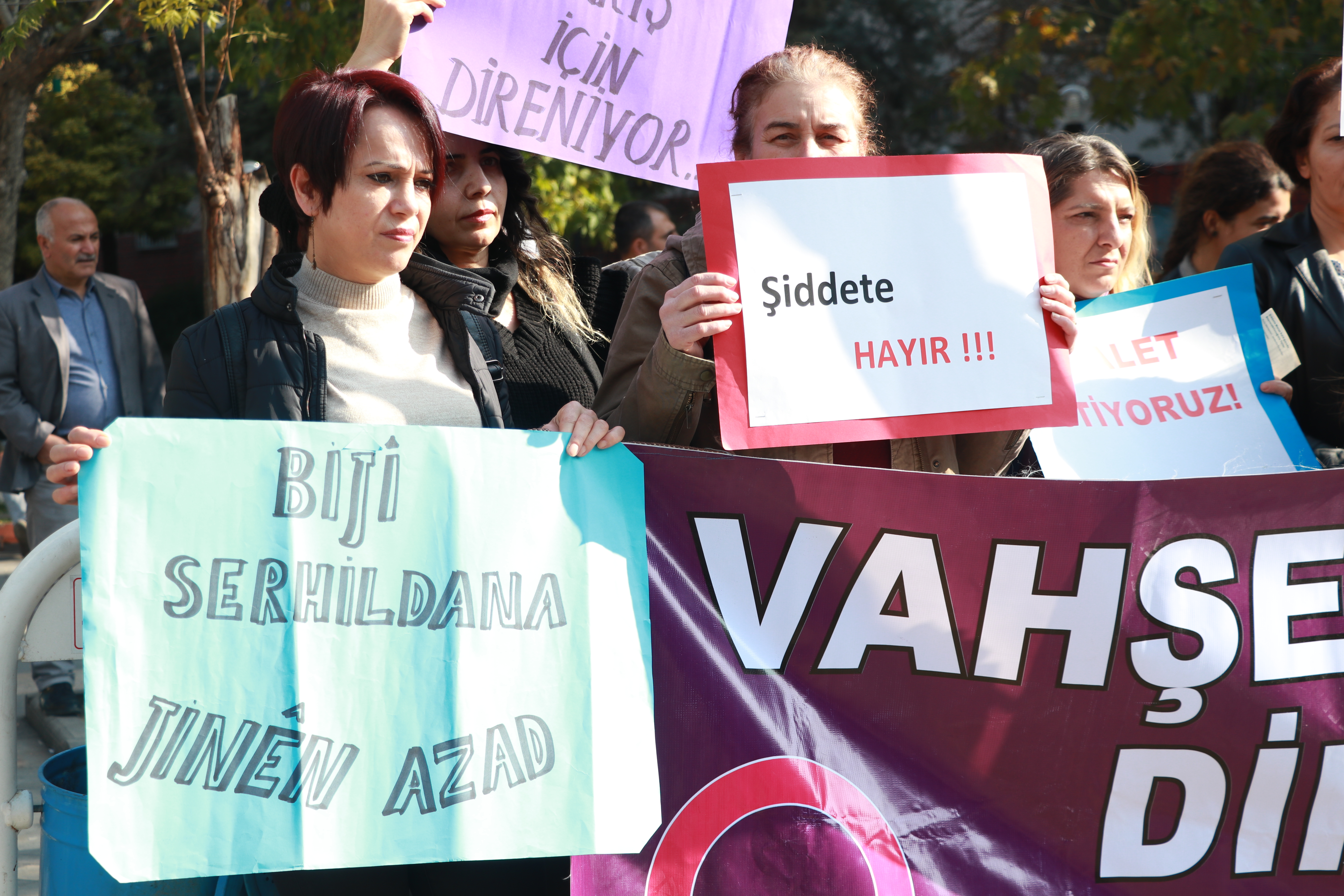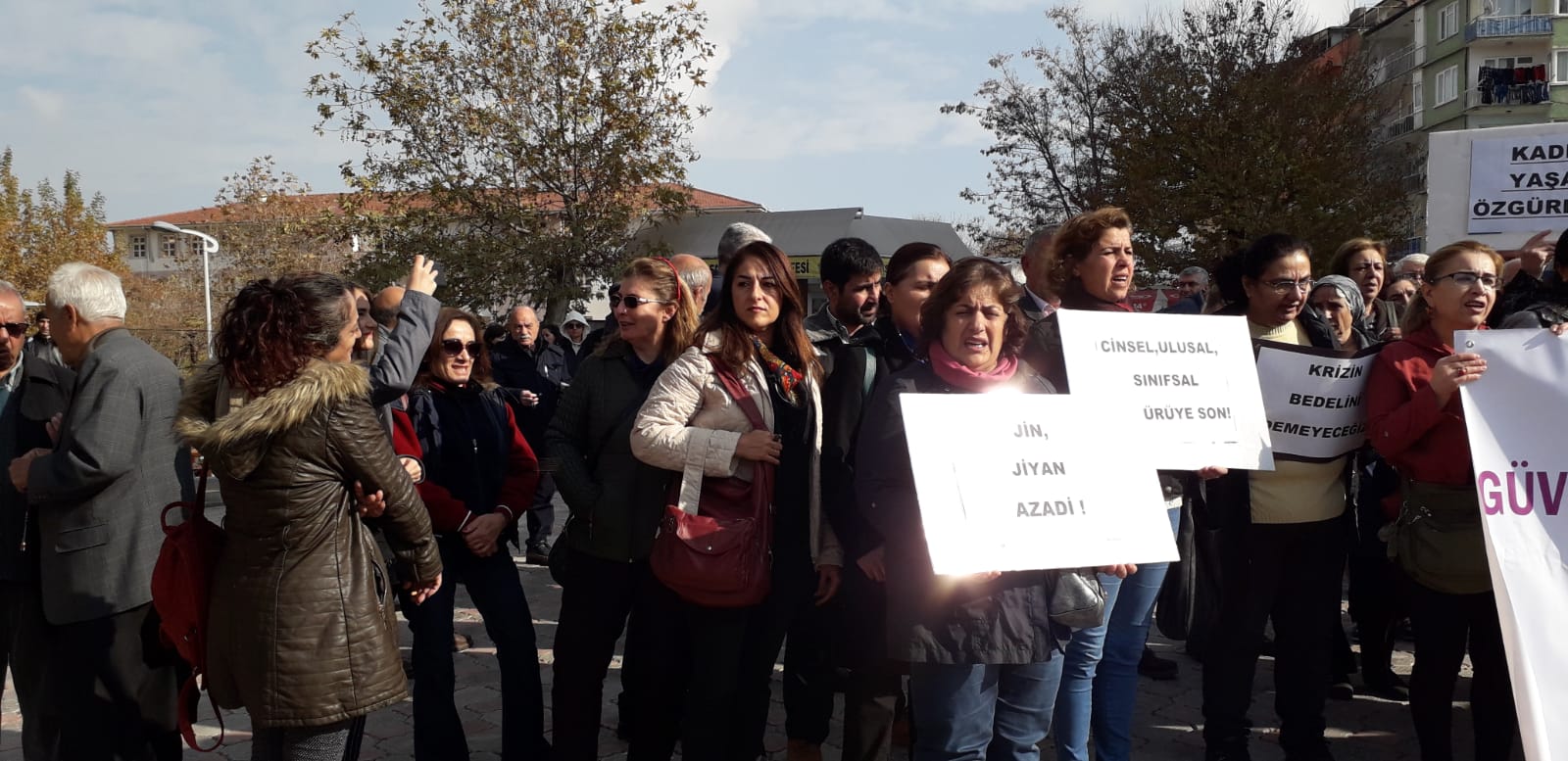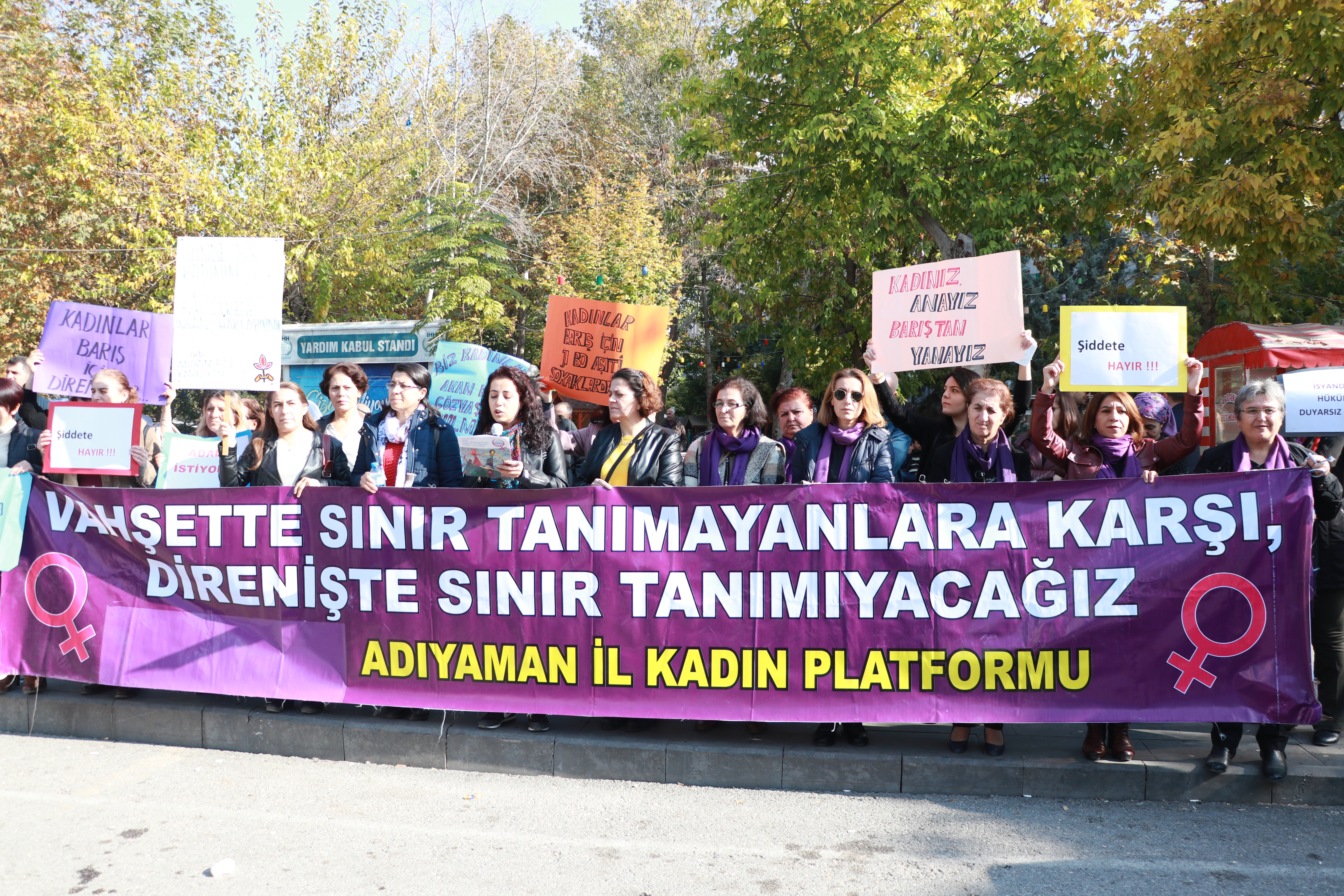 “Vahşete sınır tanımayanlara karşı, direnişte sınır tanımayacağız” pankartı açan il kadın platformu bileşenleri “Jin jiyan azadi” sloganı attı. Basın açıklaması sırasında maça giden Adıyaman 1954 Spor taraftarları “Kadına uzanan eller kırılsın” sloganı atarak kadınlara destek verdiler.