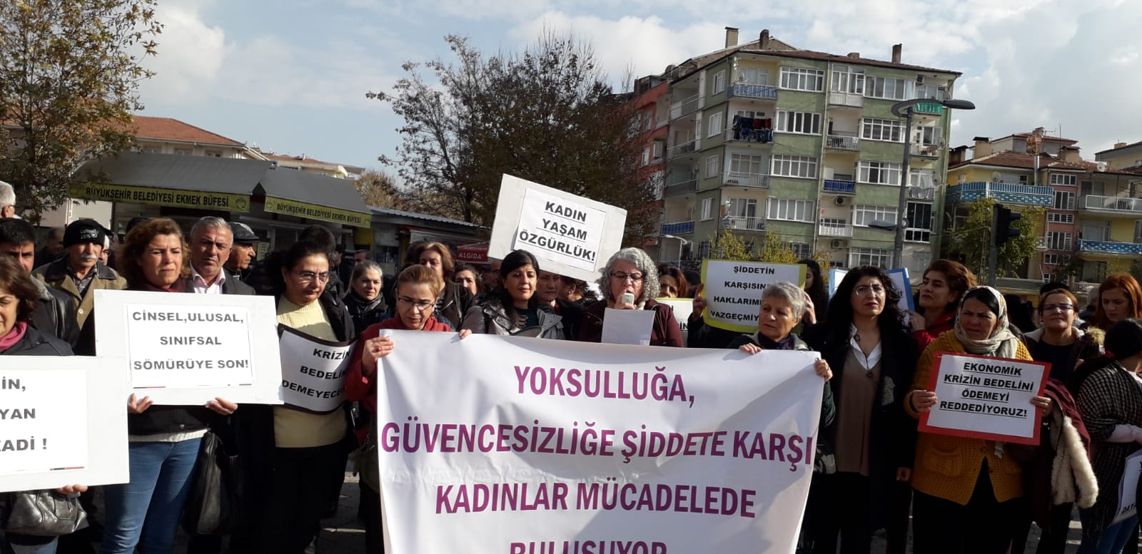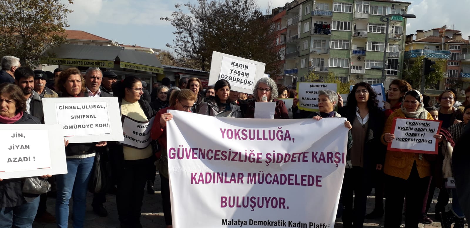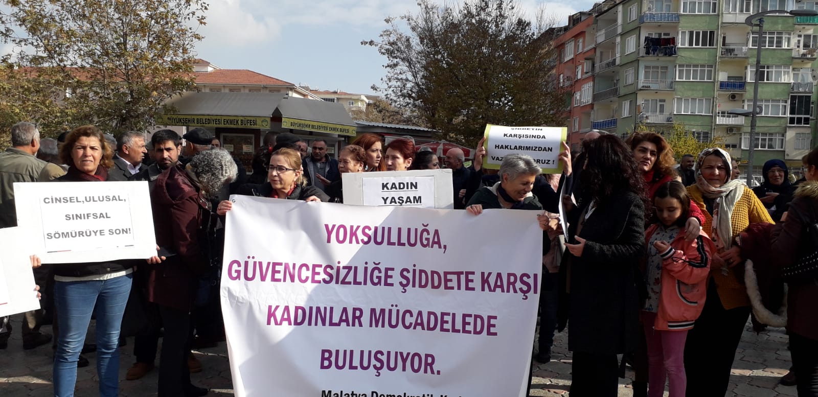 25 Kasım Kadına Şiddete Karşı Uluslararası Mücadele Günü vesilesiyle Malatya Demokratik Kadın Platformu, Turan Emeksiz kavşağında bulunan 1 Mayıs Meydanı’nda bir araya geldi. “Yoksulluğa güvencesizliğe, şiddete karşı kadınlar mücadelede buluşuyor” pankartı açan kadınlar sık sık sloganlar attı.