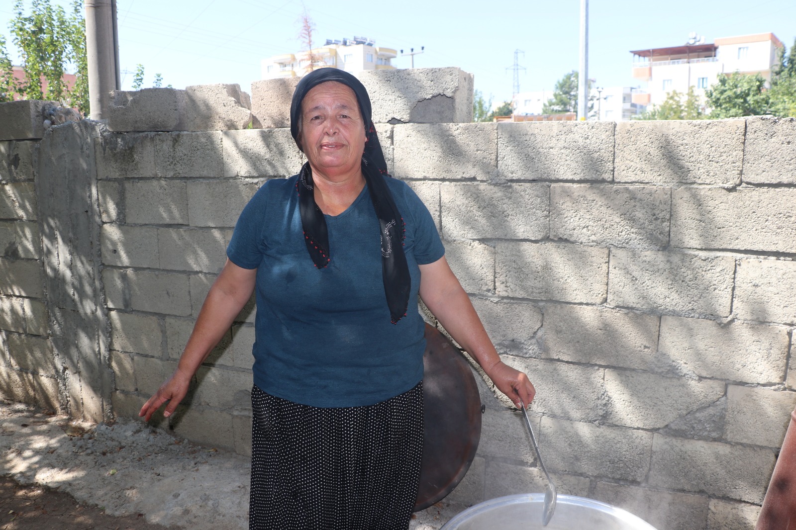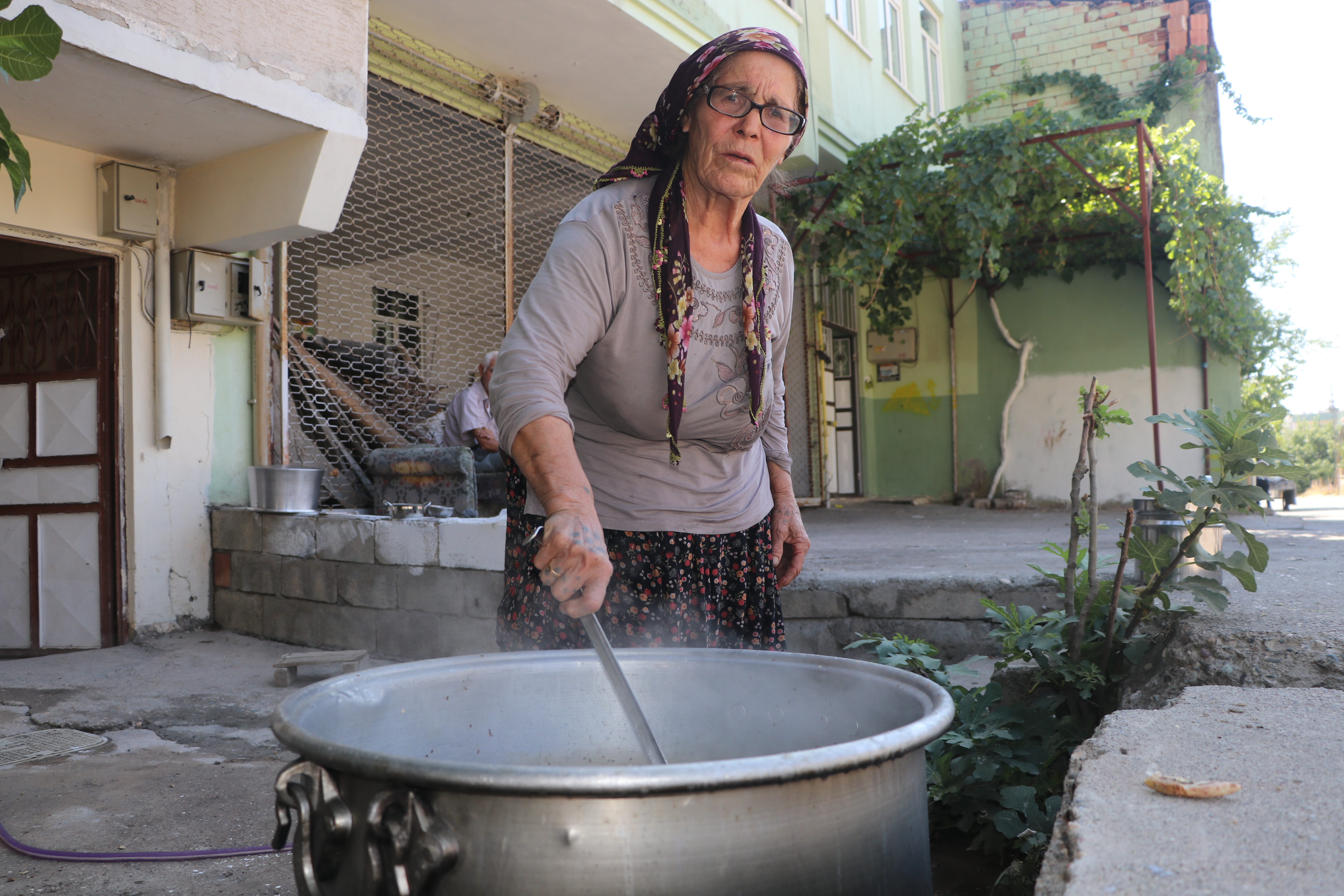 Alevilerin yoğun olarak yaşadığı Yeni Mahalle’de cemevinin bulunduğu alanda sokakları gezmeye devam ederken bir bahçeden yükselen dumanı görüyoruz. Evin kapısını çalıyoruz. Kapıyı açan Yeni Mahalle cemevinde semahçı olan Nurey Kakız, Zeynel Abidin’in Kerbela’dan sağ kurtulduğu öğrenildiği için biz bu Aşure’yi şükür lokması olarak pişiriyoruz diyor ve şöyle devam ediyor: