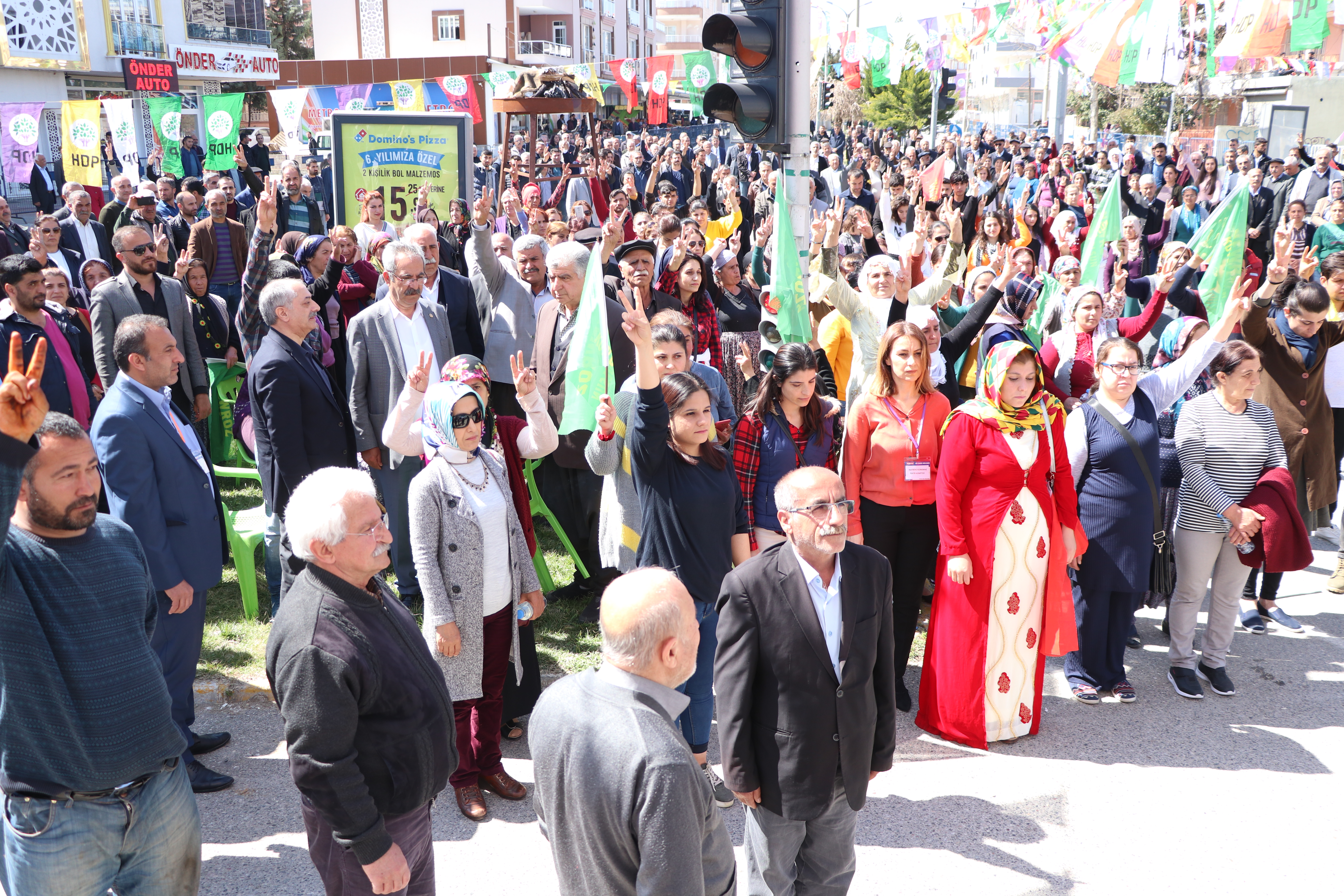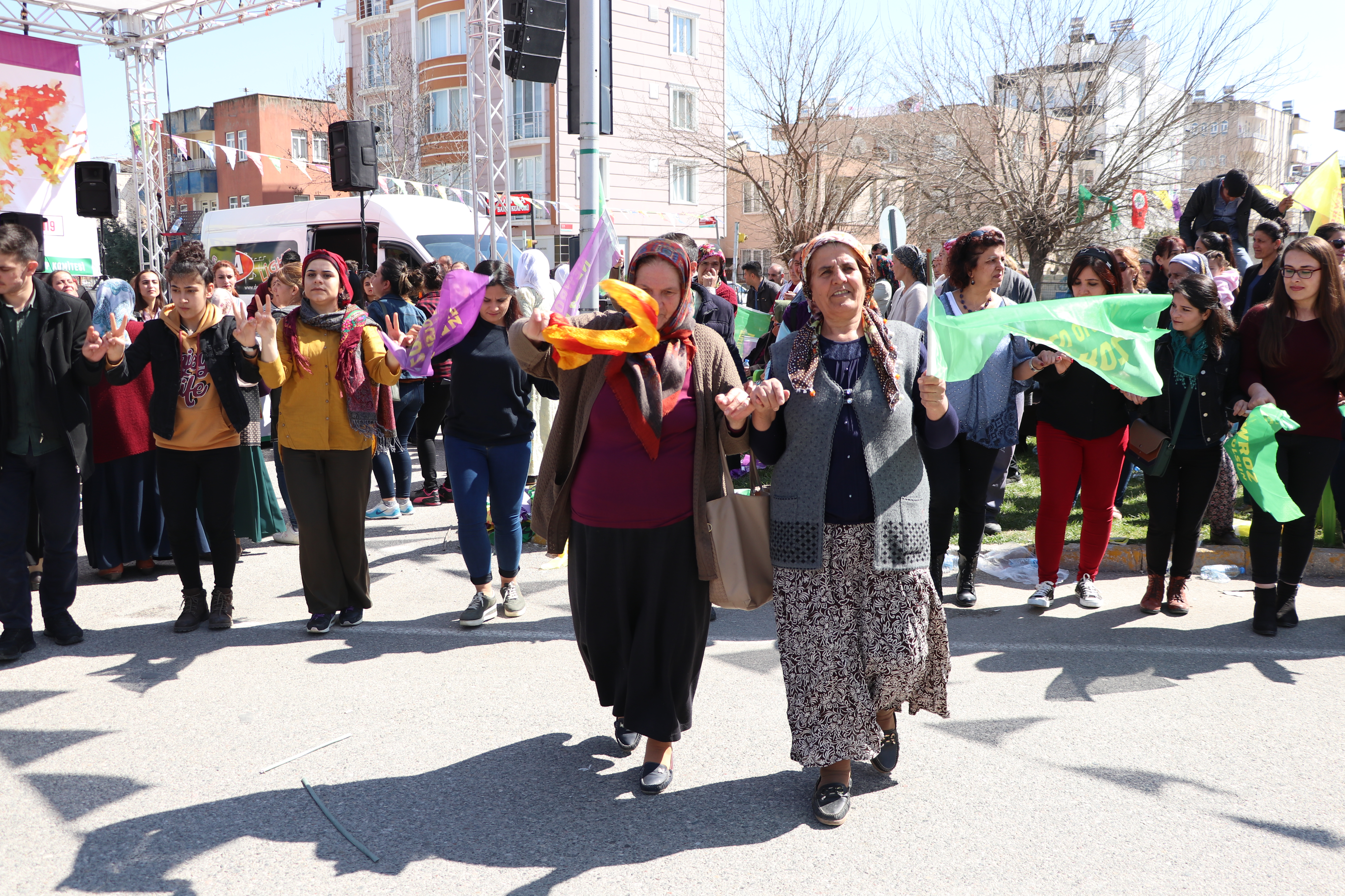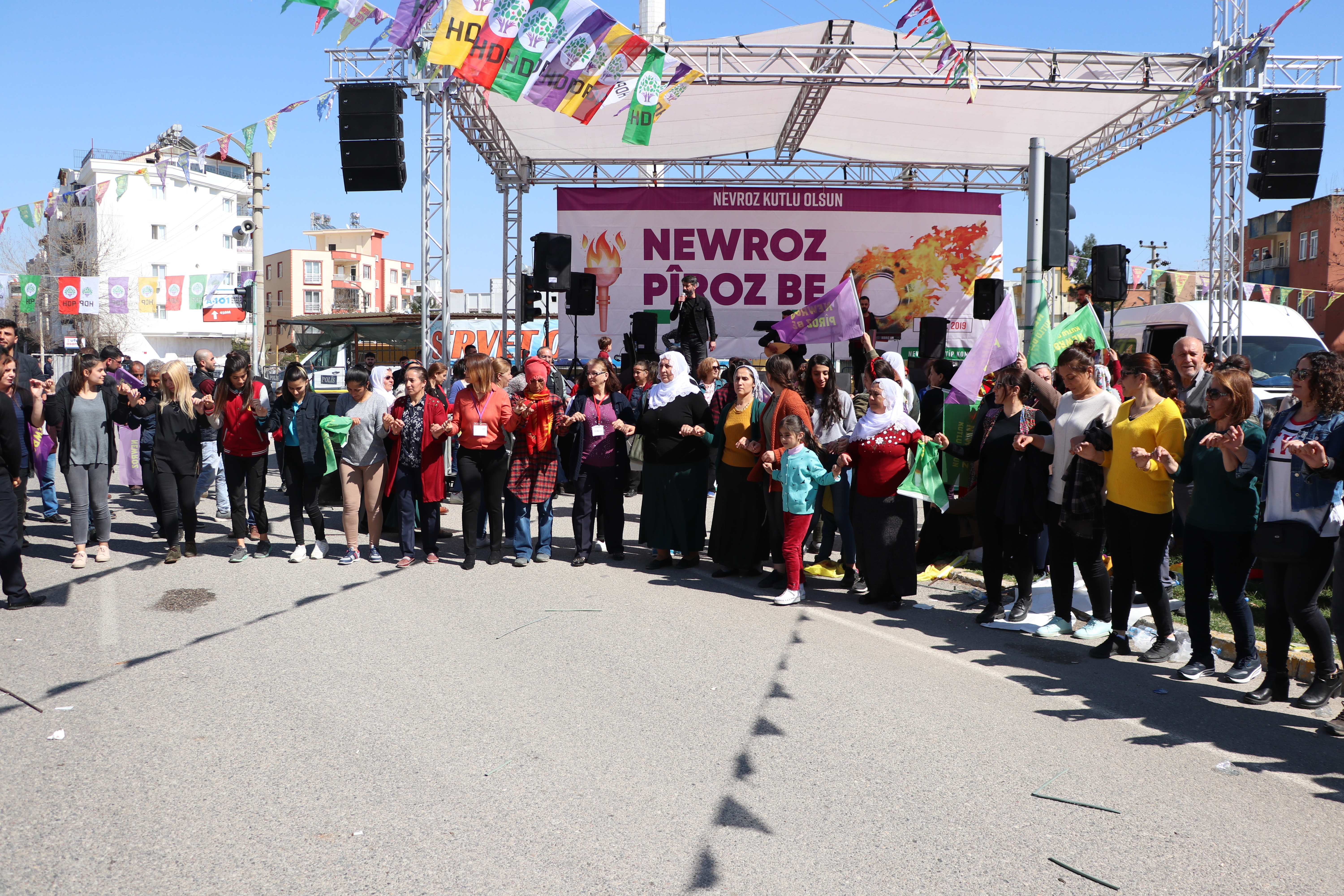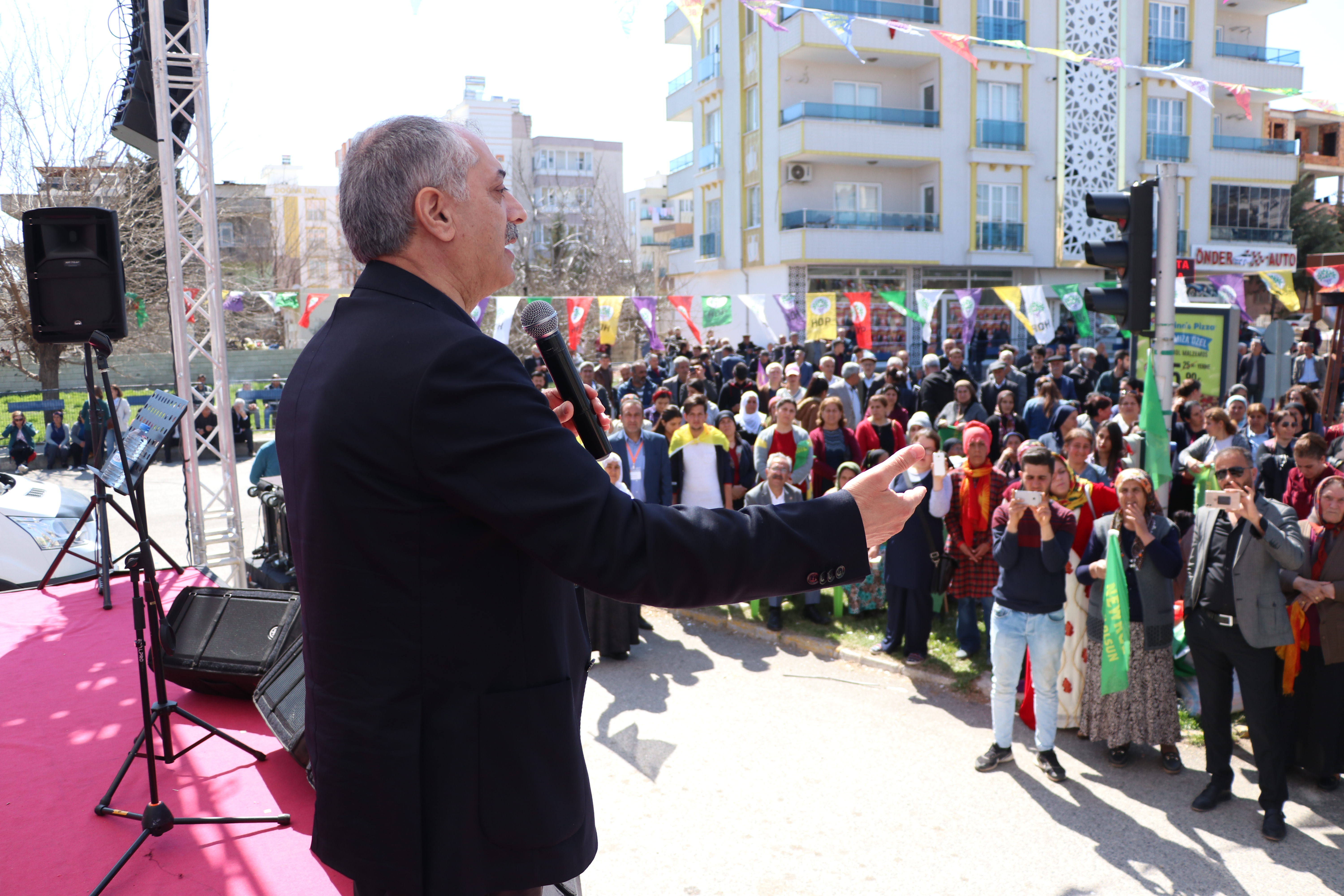 Çok zorlu bir süreçten geçildiğine vurgu yapan Erdoğmuş, “Nasıl ki baharın gelişini Newroz müjdeliyorsa, yemyeşil olmanın, yeniden hayat bulmanın kainatta yeni bir hayatla buluşmanın önüne geçmek mümkün değilse; özgürlüğün, eşitliğin barışın da bu Newroz’un içinde saklı olduğuna ismimiz gibi eminiz” diye konuştu.