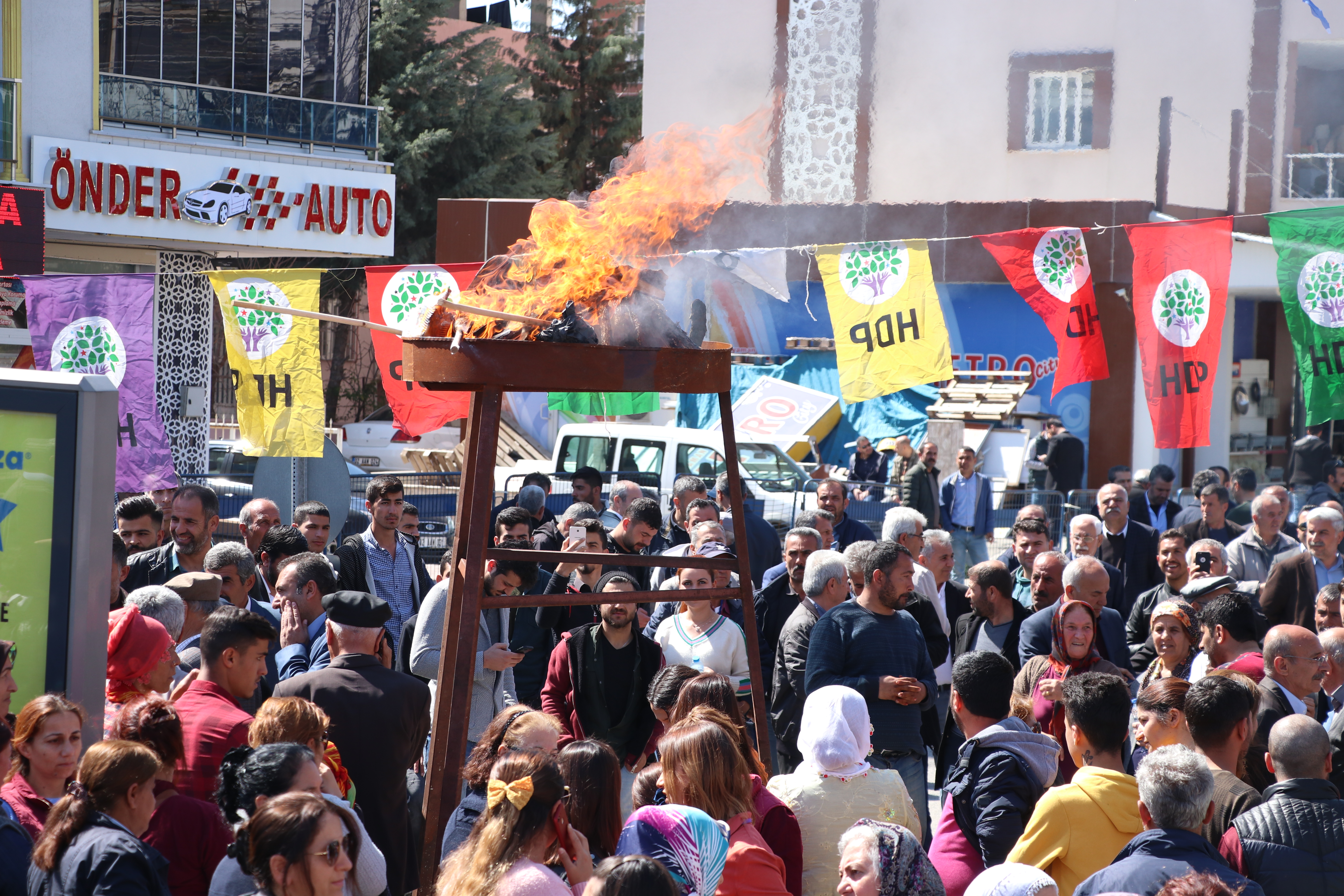 Demokrasi mücadelesinde yaşamını yitirenler anısına yapılan bir dakikalık saygı duruşunun ardından HDP Milletvekili Nimetullah Erdoğmuş, eski HDP Adıyaman Milletvekili Behçet Yıldırım ve kadınlar Newroz ateşini yaktı.