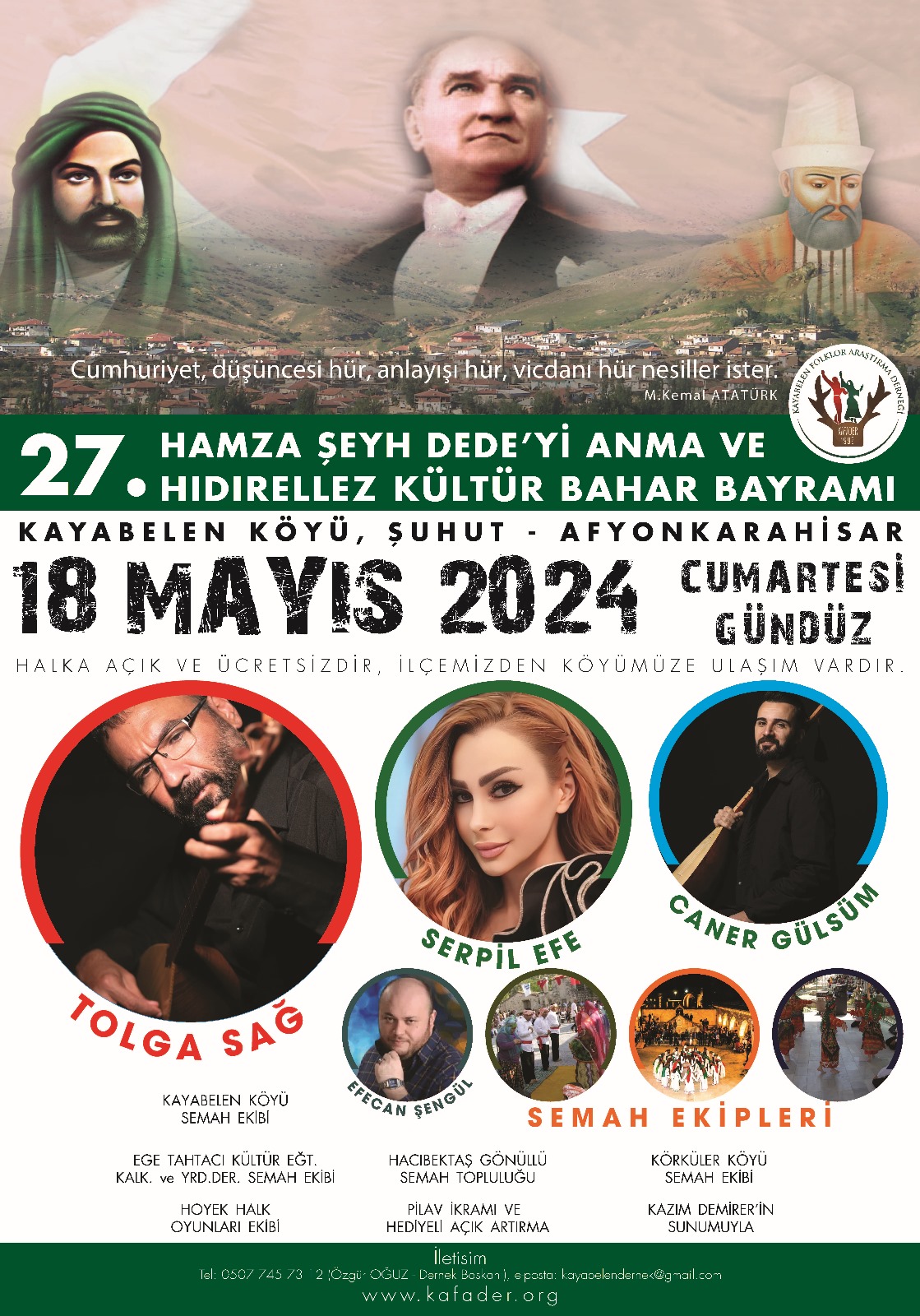 Her yıl Kayabelen Folklor ve Araştırma Derneği tarafından yapılan ve 1 gün sürecek olan 27. Hamza Şeyh Dede’yi anma ve Hıdırellez Bahar Bayramı kutlanacak. sanatçılar Tolga Sağ, Sepil Efe, Caner Gülsüm, Efecan Şengül, Ege Tahtacı Kültür ve Eğitim Kalkınma Derneği, Hacı Bektaş Gönüllüler Semah Topluluğu, Körküler Köyü Semah Topluluğunun katılacağı anma, 18 Mayıs Cumartesi günü başlayacak.