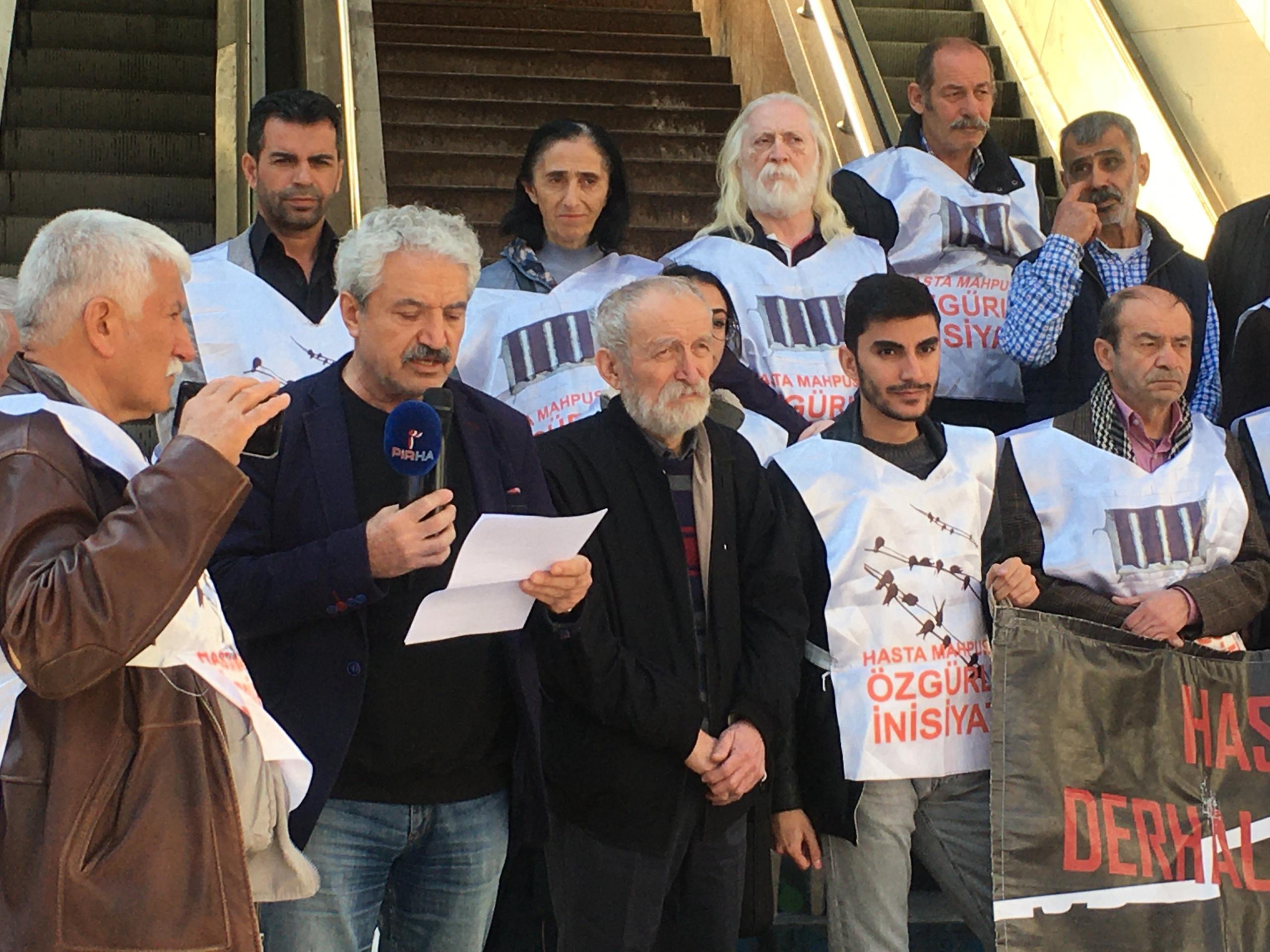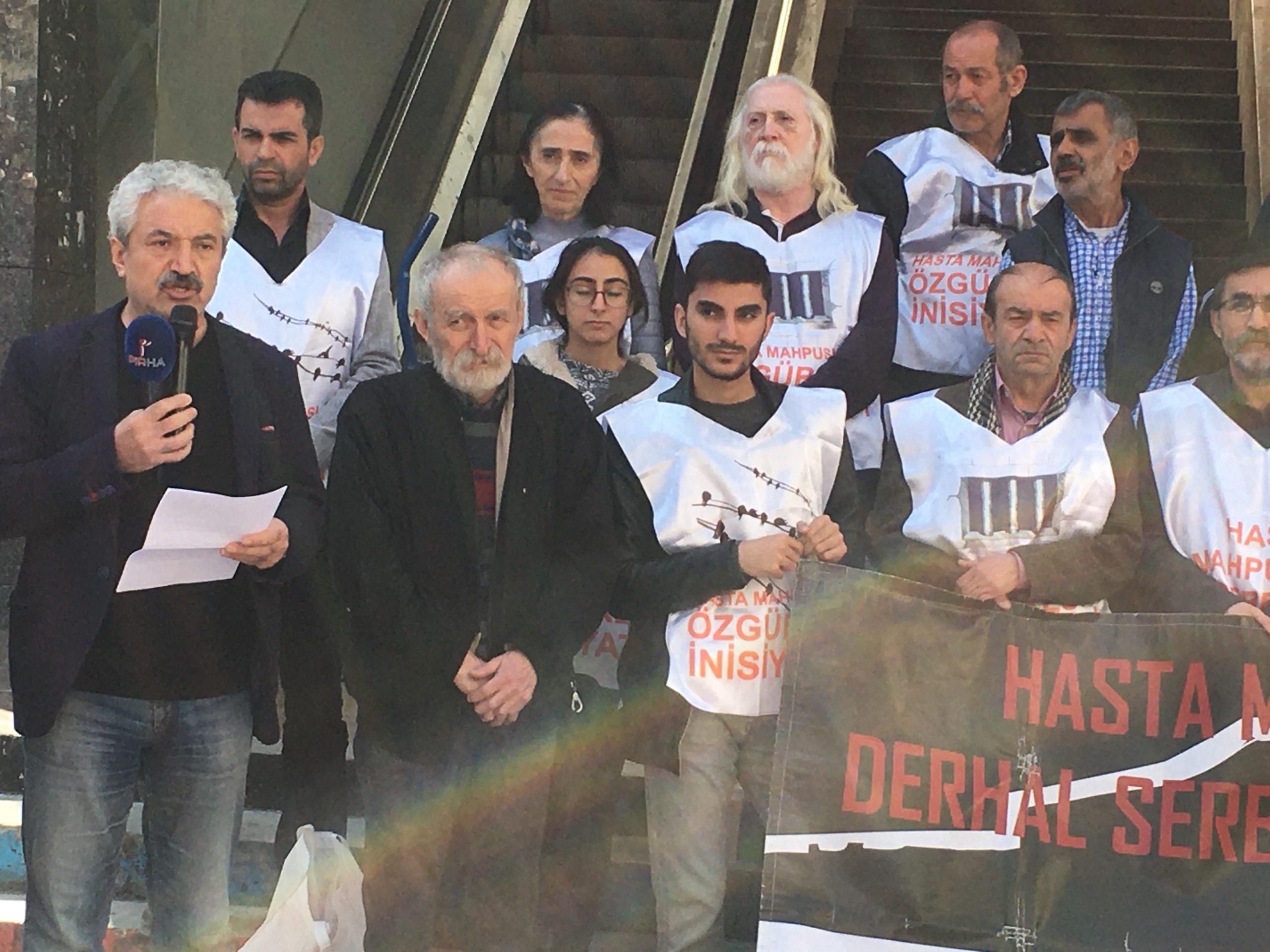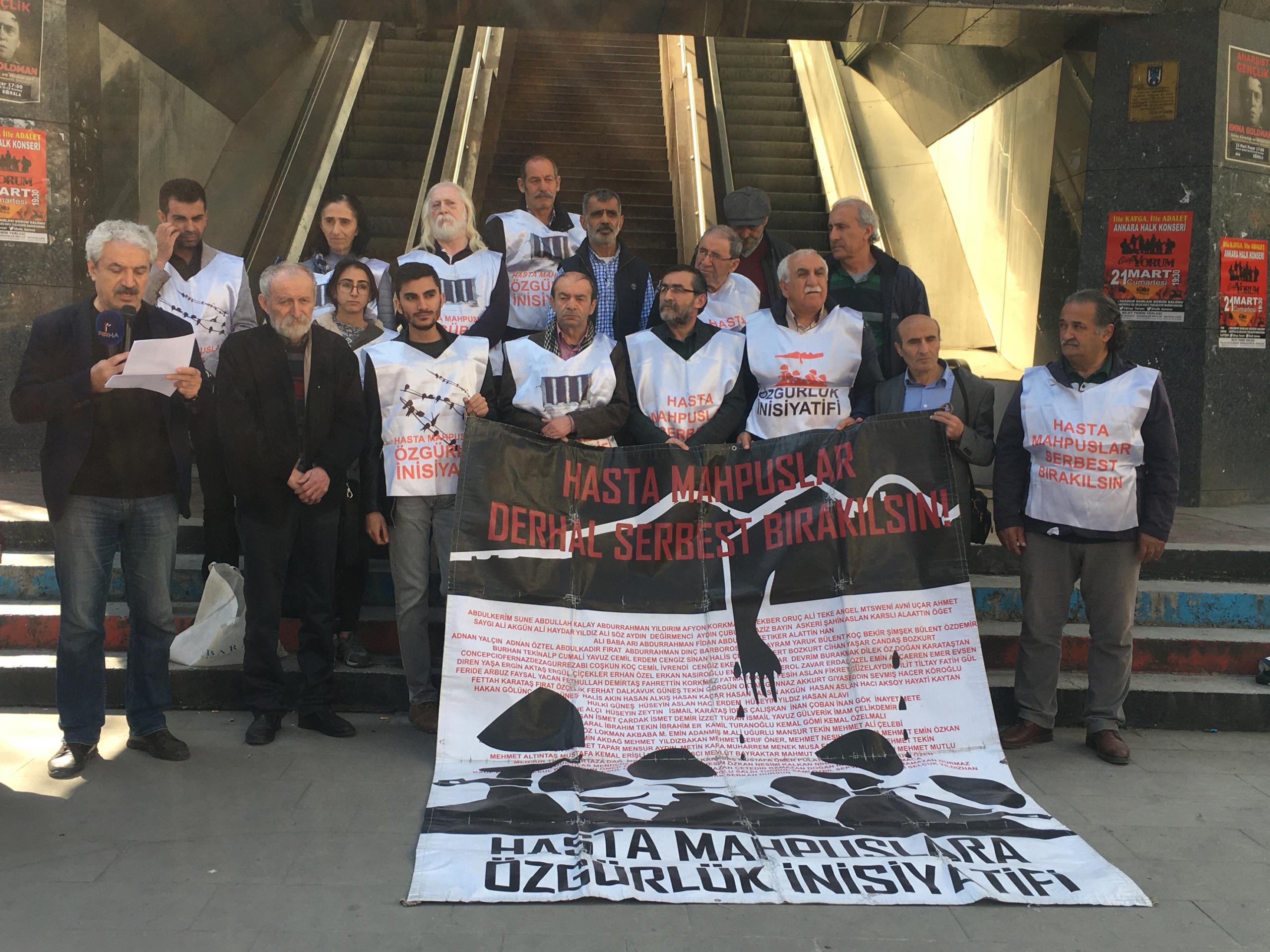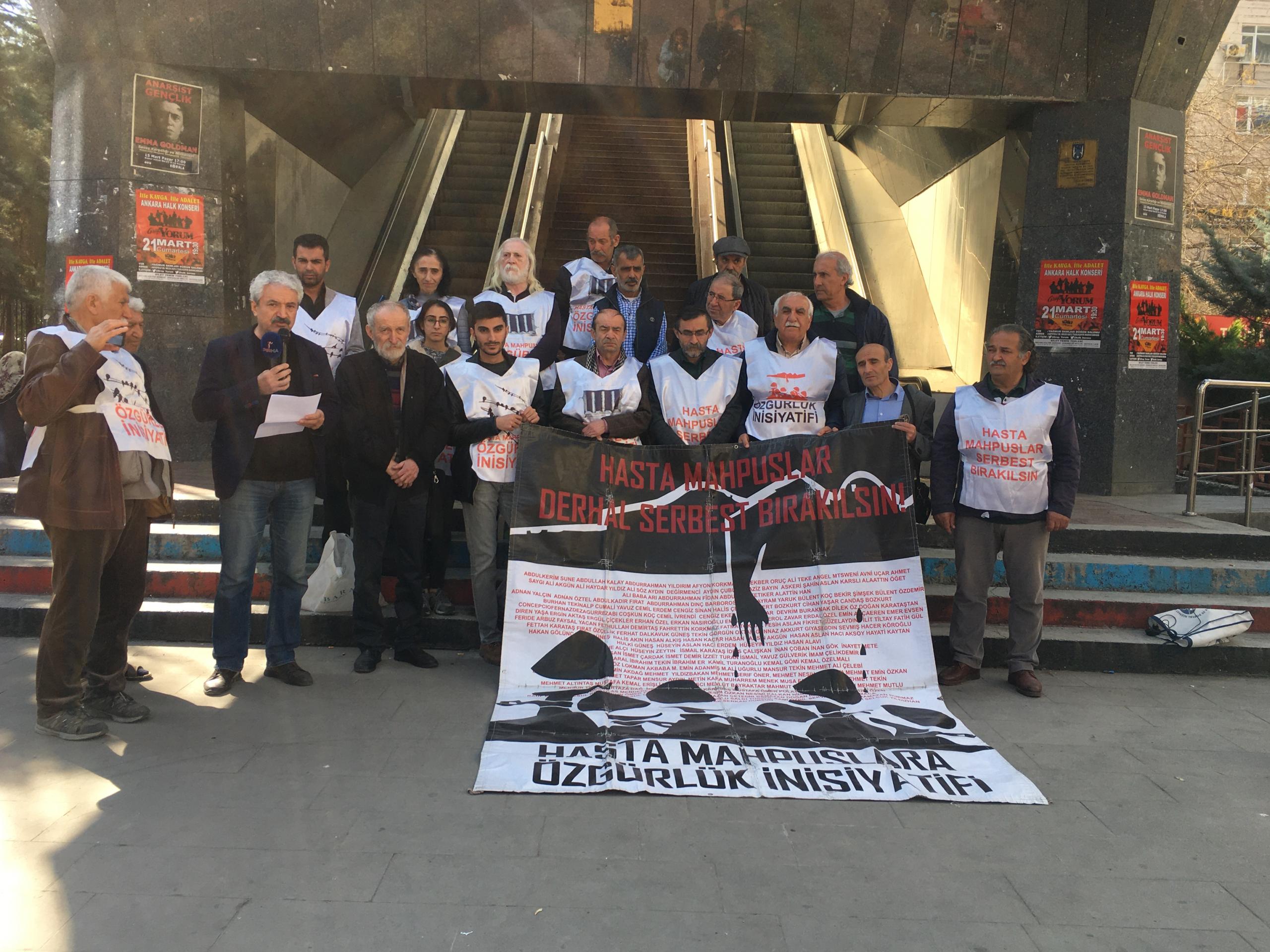 Hasta Tutsaklar İnisiyatifi adına açıklamayı okuyan İHD Ankara Şube Eş Başkanı Fatin Kanat, “Hasta mahpuslar konusu bu ülkenin en büyük ve neredeyse en görünmez hale getirilmeye çalışılan başında gelmektedir. Bir ülkenin nasıl olduğunu anlamak için cezaevleri rejimine bakmak yeterli olacaktır, Hasta mahpusların durumları giderek ağırlaşmakta, çoklu hastalıklar oluşmakta, mahpuslar ölümün eşiğine kadar getirilmektedir, Ancak tüm bu sorunlara kalıcı çözüm bulunacağına sorunlar daha da çoğaltılmaktadır, Örneğin tekli ring araçlarıyla saatlerce süren sevkler, kelepçeli muayene dayatması, sevklere zamanında çıkarılmamaları, hastanelerde ayrımcı muamelelere maruz kalmaları, gün ışığından yeterince faydalandırılmamaları, yetersiz beslenme, temiz suya erişimde problemler, hijyenik olmayan ortamlar ve daha pek çok sorunlar hasta mahpusların durumunu daha da katlanılmaz hale getirmektedir” ifadelerini kullandı.