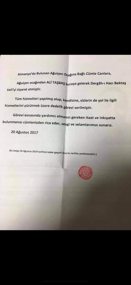 Son olarak yine Hacı Bektaş Veli Dergahı’nda yapılan görevlendirme ile dede ilan edilen Ali Taşbaş adına düzenlenen bir belge çıkmıştır karşımıza. Kendisini bilmeyenlerin, yol adına, ocaklarımız adına sarf ettikleri sözler, ocağımız adına, yol adına üzücü olduğu kadar inancımızın edep ve erkanına uymamaktadır.
