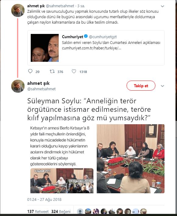 Süleyman Soylu: “Anneliğin terör örgütünce istismar edilmesine, teröre kılıf yapılmasına göz mü yumsaydık?” sözlerine cevap veren Şık AKP hükümetinin 5 Şubat 2011 tarihinde Cumartesi annesi Berfo Kırbayır ile yaptığı görüşmenin resimlerini de sayfasında yayınladı.“NAYLON KAHRAMANLARA DA BU ÜLKE TESLİM OLMADI”