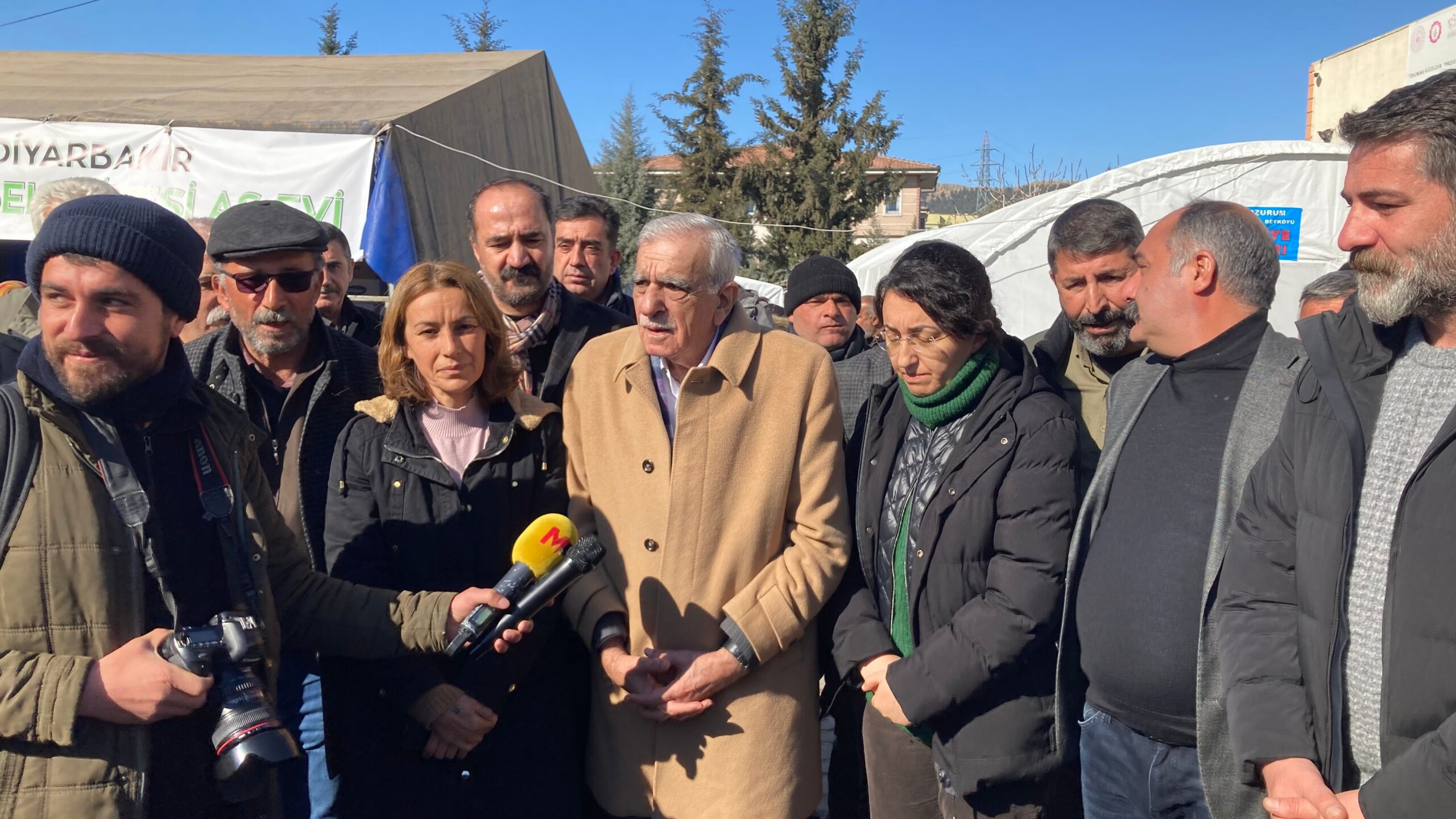 Burada şu an çok büyük bir kalabalık var, kendi ihtiyaçlarını karşılamak için buraya geliyorlar. Aynı zamanda Diyarbakır Çınar Belediyemizin bir aşevi burada. Şunu düşünün 50’yi aşkın belediyemizden sadece kayyım atanmayan 6 belediyemiz var ve bunlar da depremzedelere yardım ulaştırmak, en azından sıcak bir çorba ulaştırmak için ilk andan itibaren seferberdi. Bütün belediyeler bizde olsaydı, biz şimdiye çoktan depremzedelerin, felaketi yaşayan halkımızın yaralarını sarmıştık. İktidarın bu yaraları sarmadığını, iktidarın bu yaraları sarmayacağını maalesef bizler 12 gündür çok açık bir şekilde gördük. Yetmiyormuş gibi bir de yardımseverlerin, gönüllülerin yardımlarını engellemeye çalışıyorlar. Enkazın üzerinde tepinerek yeni enkazlar yaratmaya çalışan bir iktidar var. Biz bir kez daha Adıyaman’dan söylüyoruz; Demokratik Toplum Kongresi, Halkların Demokratik Kongresi, DBP ve bütün bileşenlerimizle birlikte bu çalışmaları sürdürmeye devam edeceğiz.”