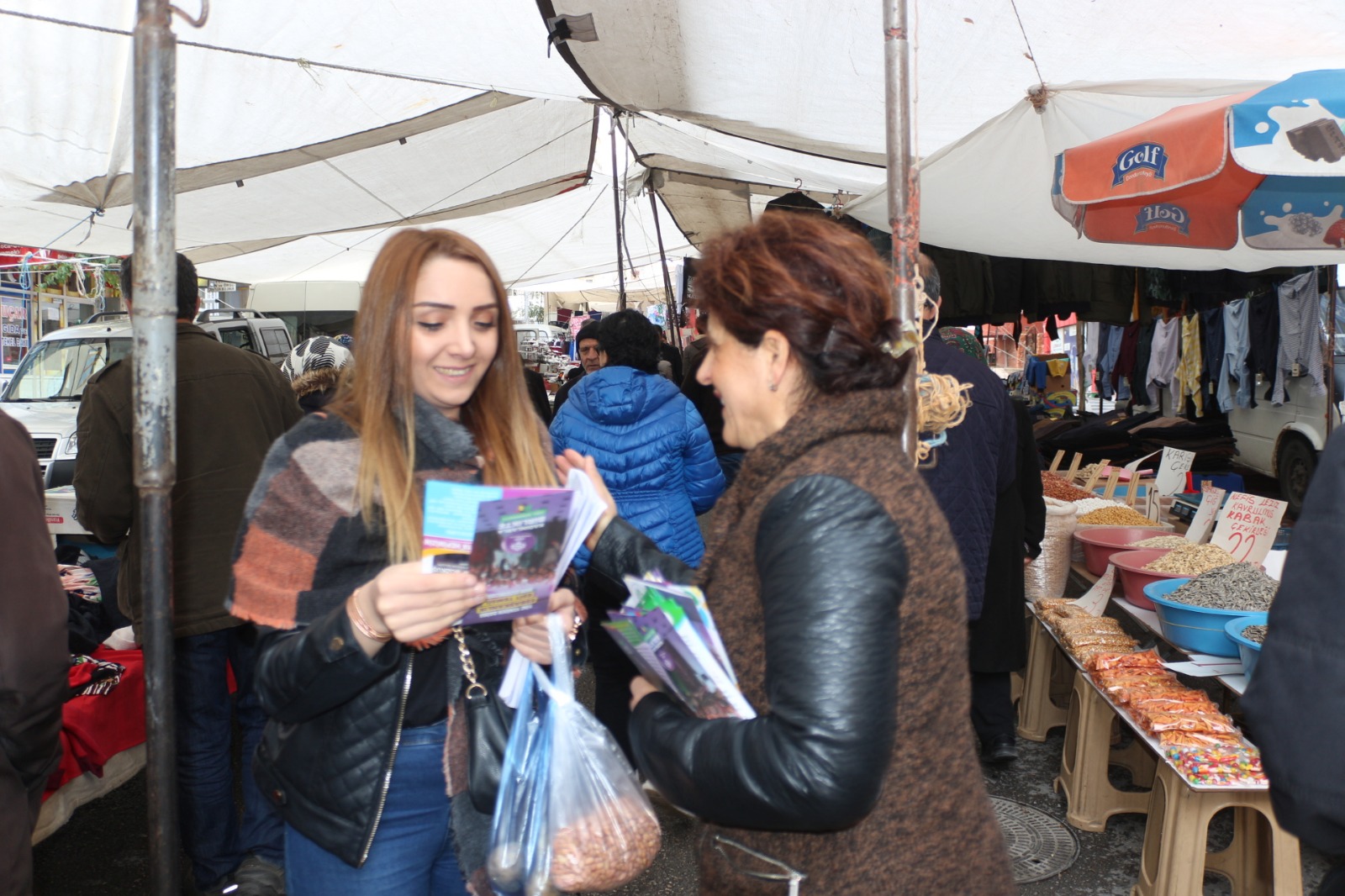 “Emeksiz caddesi üzerinde çalışmalarımıza başladık. Pazartesi pazarı esnaflarımızı gezdik, pazarda alışveriş yapan yurttaşlarımızla tokalaştık. Gördüğümüz manzara, gerçekten içler acısı bir manzara. Tarım alanlarını betona gömenler, halkımızı patatese, soğana hasret bırakanlar gözüme çarpan fiyat en düşük 5 TL civarında kilo olarak. Tarım alanlarını imara açıp, patatesle soğanı halka yoksun bırakıp, sonra patlıcan ile mermiyi kıyaslayanlar bu manzaradan utanmalıdırlar. Bizler HDP adayları olarak, nasıl bir belediyecilik, tarım politikası ve doğayı konuşmamız gerekir. Bunu ancak vatandaşlara ve emekçilere anlatabiliyoruz. Karşımızda başka konuşacağımız muhatap yok. Halk gerçekten yoksullaşmış, alışveriş yapamaz duruma gelmiş. Tarımı, ormanı bitirdiler ve şehirleri beton yığınına çevirdiler. Bundan dolayı HDP belediyeciliğinin neler yapacağını halkımıza bıkmadan, yorulmadan anlatacağız.”