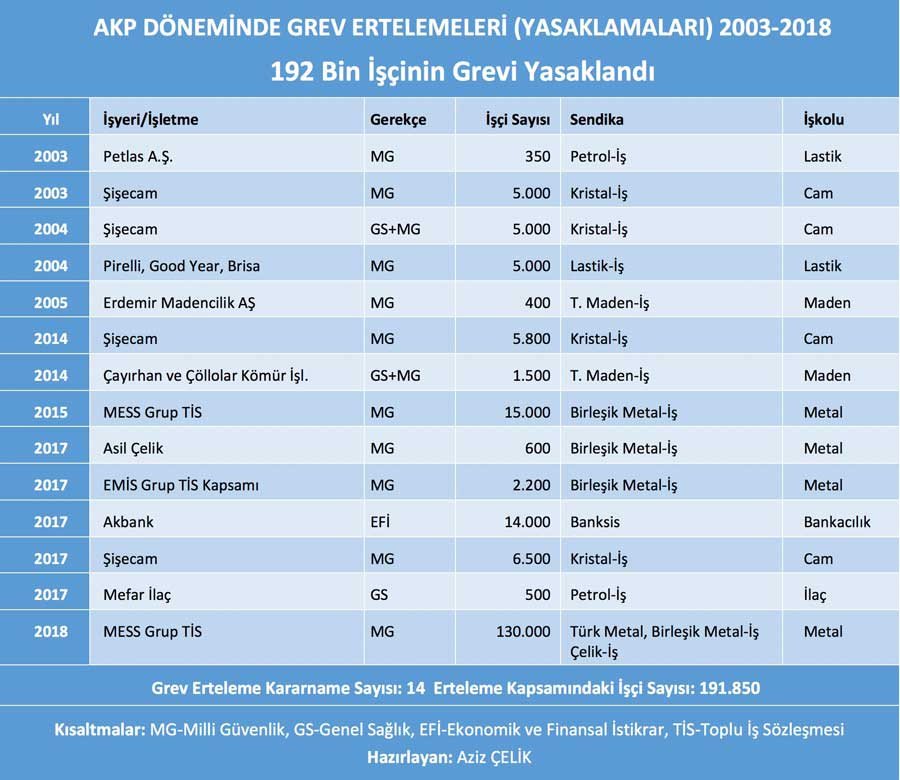 1) AKP Hükümetinin yasakladığı ilk grev 1 Temmuz 2003’te Petrol-İş’in örgütlü olduğu Petlas Lastik Sanayi ve Ticaret AŞ’deki grev oldu.