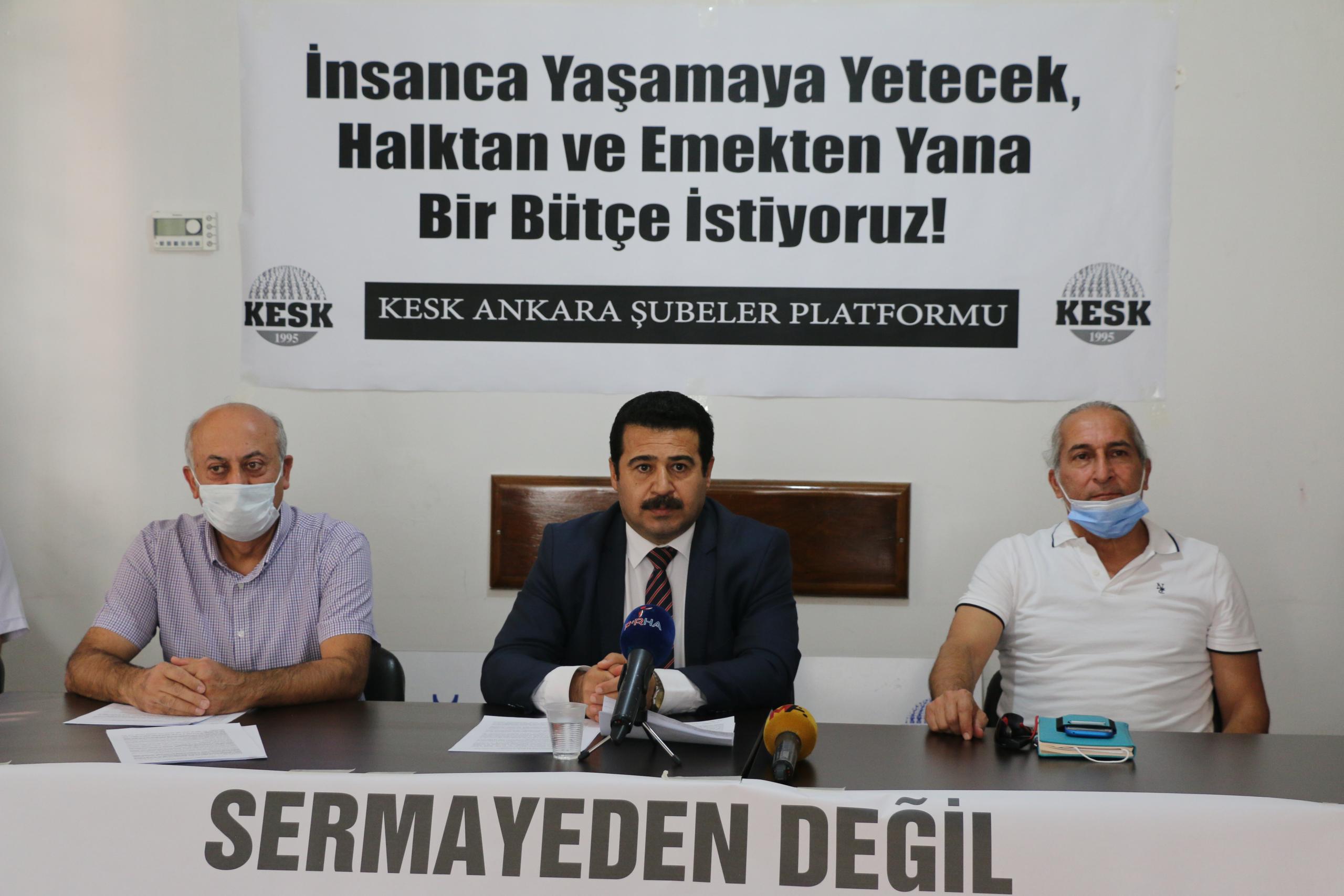 KESK Ankara Şubeler Platformu, “Gerçeklerin üstünü her geçen gün artan baskı, zor, şiddet ve sansür politikaları ile örtmeye çalışıyorlar” diyerek toplum sağlığının ciddi bir tehdit içerisinde olduğunun altını çizerken “Olağanüstü koşullarda dar gelirlilerin, ücretli kesimlerin salgından korunarak nefes almasını ve insanca bir yaşam sürmesini sağlayacak, halktan, emekten yana bir bütçe istiyoruz” diyerek bütçe için taleplerini açıkladı: