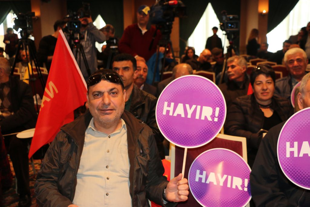 Kaya OHAL koşullarına, “Ne olursa olsun onların zorbalığı belki sokaklara yeter ama bu ülke vicdanlıdır, özgürlük ve eşitlikten yanadır. Kadınlar elde ettikleri özgürlükleri bir adım geri vermeyecektir. Bunu yıkmaya onların tankı topu sarayları saltanatları yetmeyecektir” dedi. “HDK adına Fikret Çalağan da, ‘Hayır’ meclislerinin büyüdüğünü belirterek, şunları dile getirdi: “Hayır’ı sadece gelecek için değil geçmiş içinde tartışıyoruz. Geçmişte yaptıkları için de ‘Hayır’ diyoruz. Bu iktidarın geçmişi hayırlı değildi ki geleceği de hayırlı olsun.”