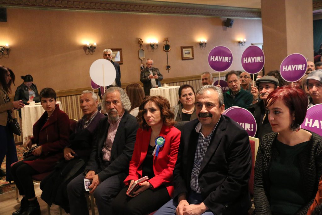 Ankara’da Neva Palas otelinde HDP Ankara İl Örgütü tarafından referandum startı verilmek amacıyla organize edilen tanıtım toplantısına çok sayıda kurum temsilcisi katıldı. Toplantıda Kürtçe ve Türkçe “Hayır” yazılı flama ve dövizler açıldı. Sık sık HDP referandum müziklerinin çalındığı toplantıya kadınların yoğun ilgisi dikkat çekti., HDP İl yöneticisi Elif Torun Öneren’in, yaptığı açılış konuşmasında 16 Nisan’da halkların gelecek umudunu ortak emekle yaratılacağını söyledi. Öneren, her alanda mücadeleyi yükselttiklerini belirterek, cezaevinde bulunan HDP’li eş başkanları tutuklularına selam gönderdi. Ahmet Aday’da Kürtçe yaptığı konuşmasında referandum tanıtım toplantısına katılanları selamladı ve herkesi referandumda “Hayır” demeye çağırdı. Aday, bütün demokratik, sosyalist, yurtsever kesimlerin bu pakete ‘Hayır’ dediklerini belirterek, “Biz demokratik bir anayasa istiyoruz” dedi. Basın toplantısının devam ettiği saatlerde önceki gün gözaltına alınan HDP PM üyesi Cemil Elden, gözaltına çıkar çıkmaz salona geldi. Daha sonra HDP İl Eş Başkanı Birsen Kaya da, yaptığı konuşmada, tutuklu HDP Eş Başkanları, milletvekilleri ve üyelerini selamladı. 16 Nisan’da umudu büyüteceklerini belirten ve son bir buçuk yılda yaşananlara dikkat çeken Kaya, ülkenin “beka sorunu” söylemlerine tepki gösteren ve “AKP’nin beka sorunu var” dedi. Kaya, AKP’nin köleci bir sistemi halklara dayattığını söyleyen Kaya, “Bu parti yıllardır zulmü başımızdan eksik etmedi” ifadelerini kullandı.