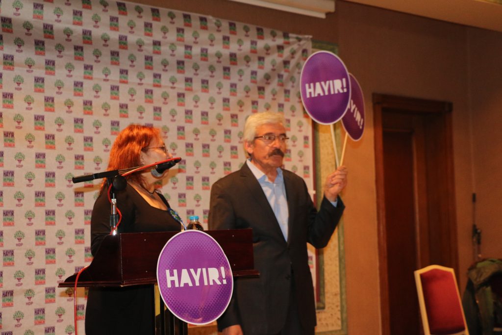 Kaya OHAL koşullarına, “Ne olursa olsun onların zorbalığı belki sokaklara yeter ama bu ülke vicdanlıdır, özgürlük ve eşitlikten yanadır. Kadınlar elde ettikleri özgürlükleri bir adım geri vermeyecektir. Bunu yıkmaya onların tankı topu sarayları saltanatları yetmeyecektir” dedi. “HDK adına Fikret Çalağan da, ‘Hayır’ meclislerinin büyüdüğünü belirterek, şunları dile getirdi: “Hayır’ı sadece gelecek için değil geçmiş içinde tartışıyoruz. Geçmişte yaptıkları için de ‘Hayır’ diyoruz. Bu iktidarın geçmişi hayırlı değildi ki geleceği de hayırlı olsun.”