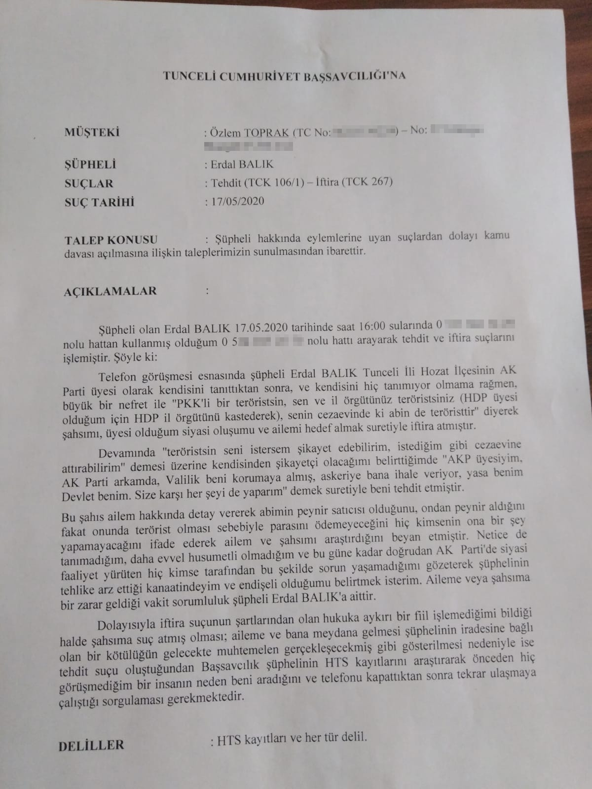 Erdal Balık hakkında kamu davasının açılması için Tunceli Cumhuriyet Başsavcılığı’na dilekçe veren Özlem Toprak, Balık’ın kedisini arayarak, AKP Hozat İlçe örgütünün üyesi olduğunu, büyük bir nefret ile “PKK’lı bir teröristsin, sen ve il örgütünüz teröristsiniz. Senin cezaevindeki ağabeyin de teröristtir” diyerek tehdit ettiğini belirtti.