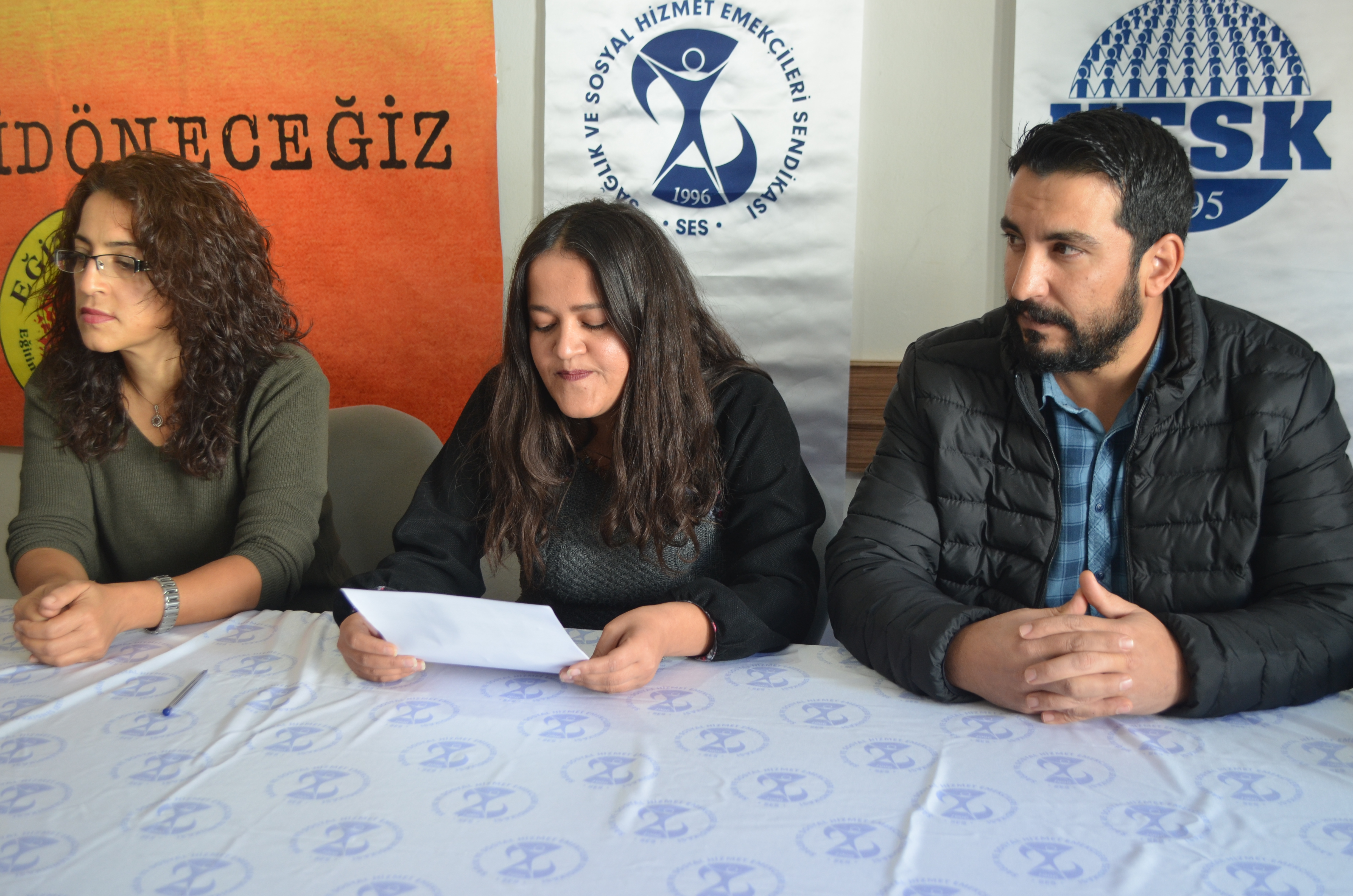 Açıklamayı okuyan SES Dersim Şube Sekreteri Duygu Kurban, “Kanun Teklifi” kamuoyuna “sağlıkta şiddet yasası” şeklinde lanse edilerek kamuoyu yanıltılmaktadır. Bu teklif sağlıkta şiddeti önlemeye dönük bir teklif değildir; sağlık alanında örgütlü kesimlerin görüş ve önerisi alınmadan, sağlık özel sektörünün ihtiyaçları düşünülerek hazırlanmıştır. Torba kanunlarda sıkça yaşadığımızın aynısı olarak birçok hususta düzenleme yapılmaktadır; ihraç edilen ve güvenlik soruşturması gerekçe gösterilerek ataması yapılmayan hekim ve diş hekimlerine özel sektörde çalışmayı yasaklayarak tam bir medeni ölü hali dayatmak kanundaki düzenlemelerden biridir” dedi.