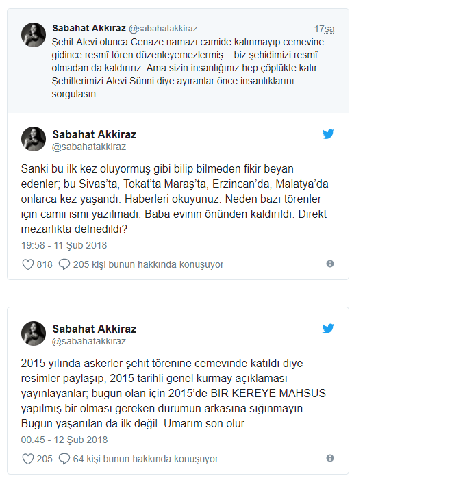 Sosyal medya üzerinden tartışılmaya başlayan Alevi askerlerin cenazelerinde resmî tören yapılmadığı iddiasına tepkiler geliyor. Sanatçı Sabahat Akkiraz sosyal medya hesabından yaptığı paylaşımlarda yaşananları kınadı: