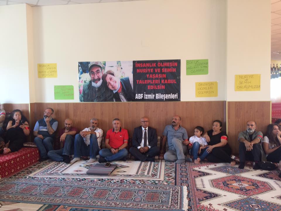 Alevi Bektaşi Federsyonu İzmir bileşenleri, 135. gündür açlık grevinde olan eğitimci Nuriye Gülmen ve Semih Özakça’nın durumuna dikkat çekmek için bugün Narlıdere Cemevi’nde bir günlük açlık grevine başladı. Açlık grevine Alevi Bektaşi Federasyonu, Demokratik Alevi Dernekleri, Narlıdere Dersimliler Derneği, CHP ve HDP’de yapılan açlık grevine dahil oldu. Bugün sabah başlayan açlık grevi yarın saat 12.00’da son bulacak.