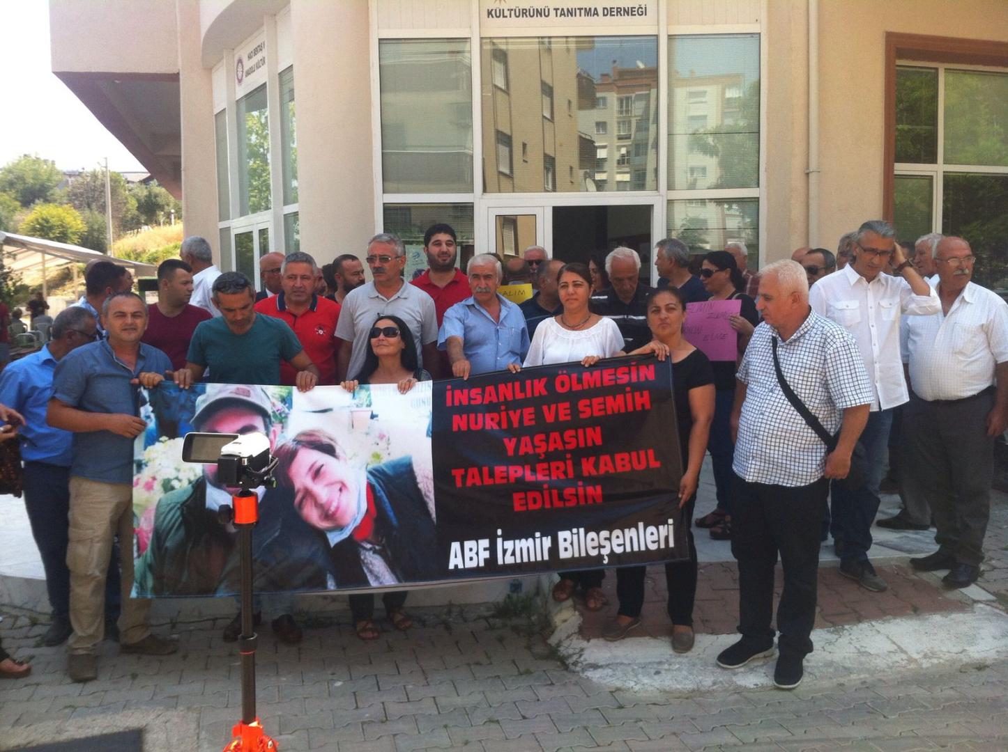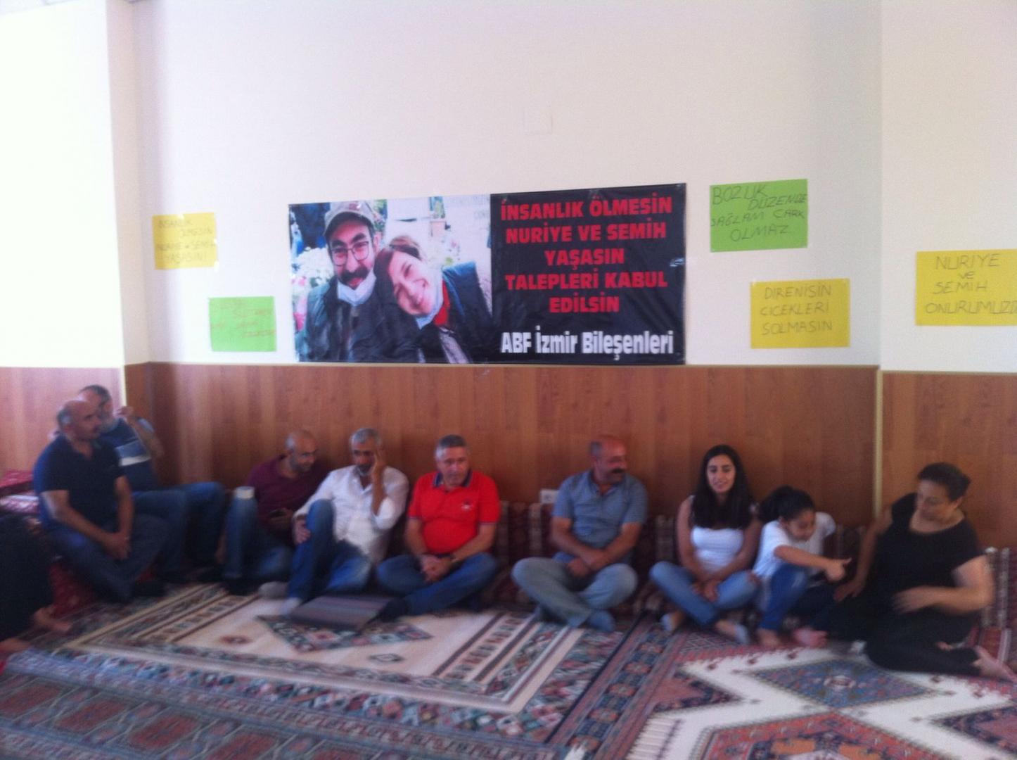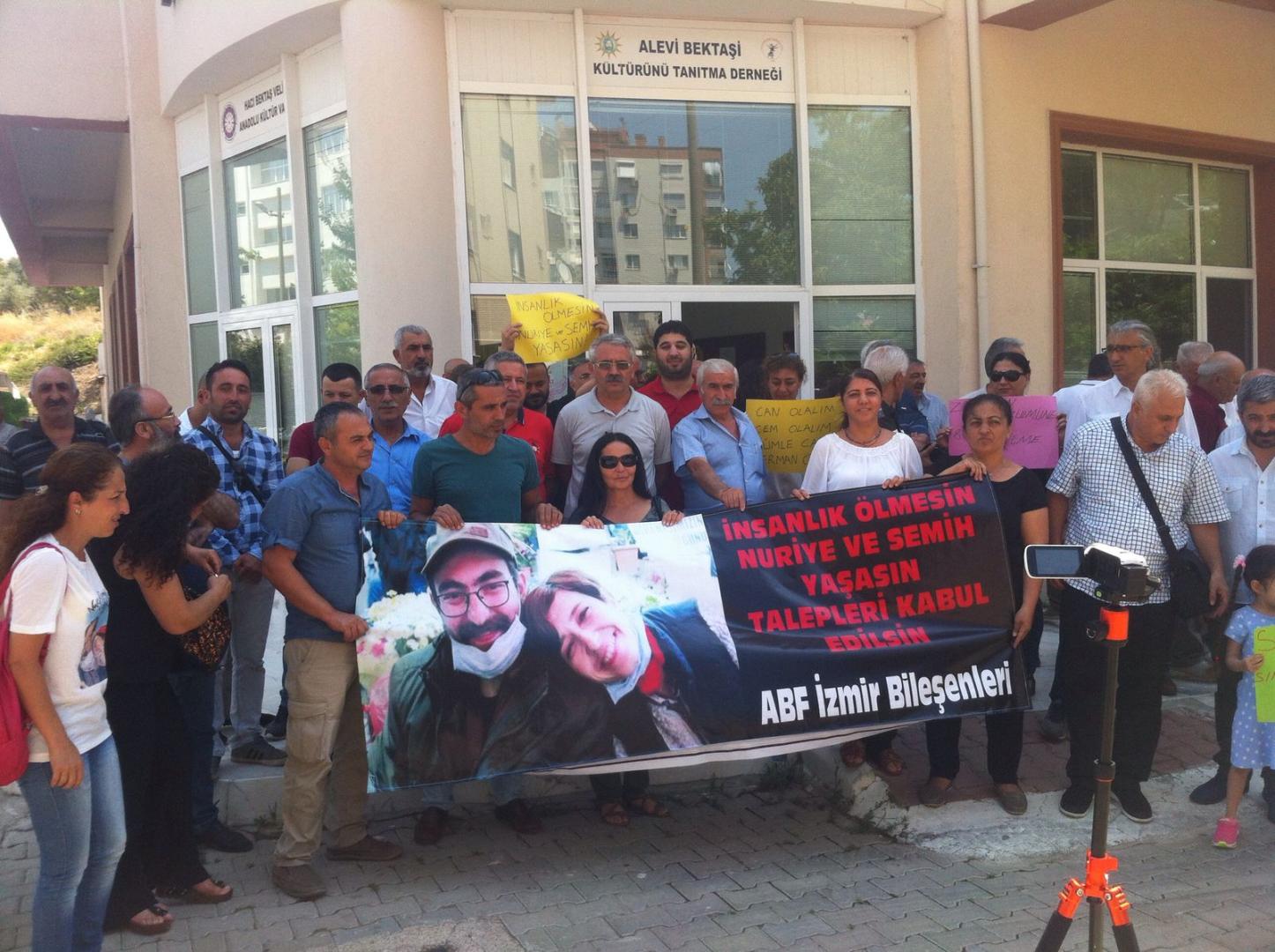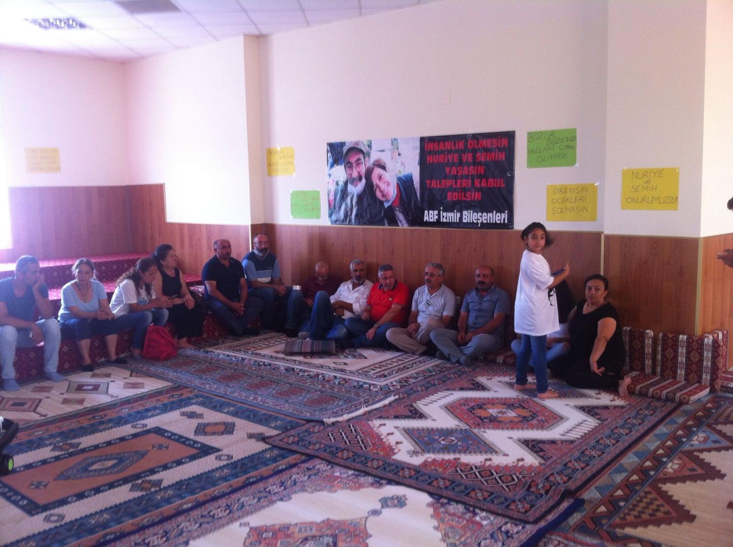 Alevi Bektaşi Federsyonu İzmir bileşenleri, 135. gündür açlık grevinde olan eğitimci Nuriye Gülmen ve Semih Özakça’nın durumuna dikkat çekmek için bugün Narlıdere Cemevi’nde bir günlük açlık grevine başladı. Açlık grevine Alevi Bektaşi Federasyonu, Demokratik Alevi Dernekleri, Narlıdere Dersimliler Derneği, CHP ve HDP’de yapılan açlık grevine dahil oldu. Bugün sabah başlayan açlık grevi yarın saat 12.00’da son bulacak.