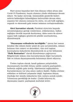 Alevi kurumlarının Pandemi sürecinin başından beri cemlerini, erkânlarını, halkın sağlığını öncelik sayarak durdurduğuna değinilen açıklamada, ‘Dayanışma ezilenlerin inceliğidir’ şiarıyla imkanı bulunan tüm cemevi, dernekler ve tüm sivil toplum kuruluşlarının bahçelerini düzenleyerek en az bir bölümünü “Halk Bostanları” olarak düzenlemek için çağrıda bulunuldu.