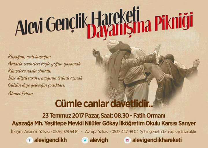 Alevi Gençlik Hareketi, İstanbul Sarıyer Fatih Ormanı’nda bir araya gelerek, dayanışma pikniği düzenliyor. İstanbul İl genelinde araç kaldırılacak. 23 Temmuz Pazar günü gerçekleşecek pikniğin adres bilgileri şöyle: