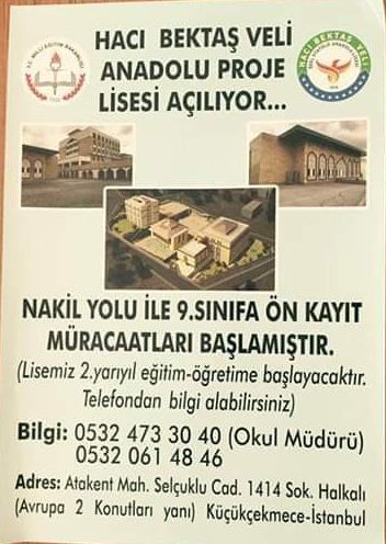 İstanbul Halkalı’da Atakent Mahallesi 2. Etap Sakarya Caddesi üzerindeki yaklaşık 16 dönüm arazi üzerinde yapılan 600 öğrenci kapasiteli Özel Statülü Hacı Bektaş Veli Proje Lisesinin temeli, zamanın Milli Eğitim Bakanı Nabi Avcı’nın da katıldığı törenle atılmıştı.