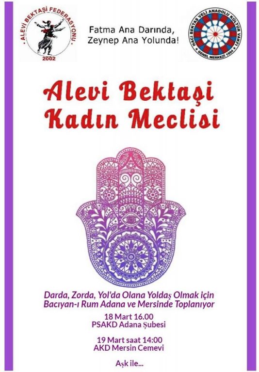 Alevi kadınlar, ABF, HBVAKV ve diğer Alevi örgütleriyle beraber Alevi Bektaşi Kadın Meclisi’ni kurmayı amaçlıyorlar. Alevi Bektaşi Federasyonu’nun çağrısı ile toplanacak olan Alevi Bektaşi Kadın Meclisi’nin Adana ve Mersin toplantıları 18 ve 19 Mart tarihlerinde yapılacak.