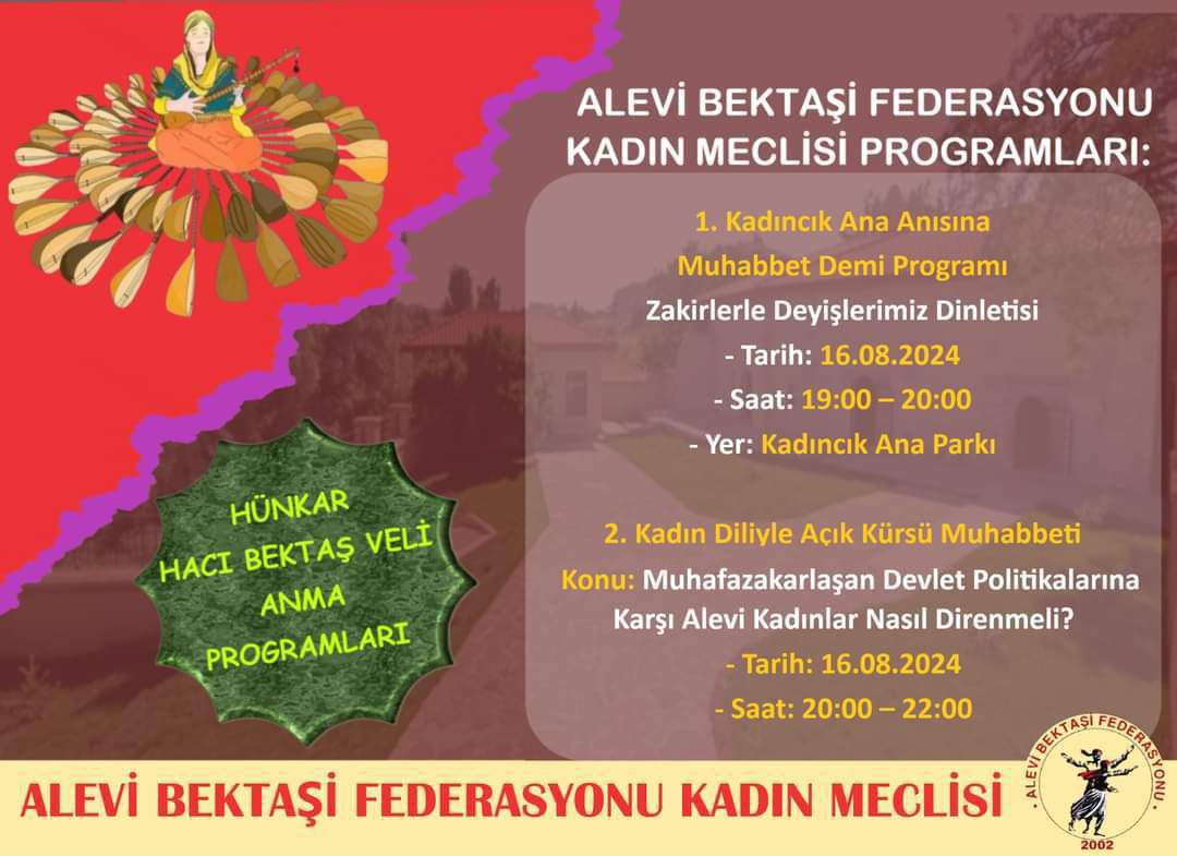 Yine 17 Ağustos tarihinde ise Hacı Bektaş Kültür Merkezi’nde Prof. Dr. Bedriye Poyraz ve Av. Esin İzel Uysan’ın katılımıyla ‘Zorunlu din dersleri ve medeni kanunun Alevi kadınların yaşamında etkileri ve önemi’ gündemde panel gerçekleşecek.