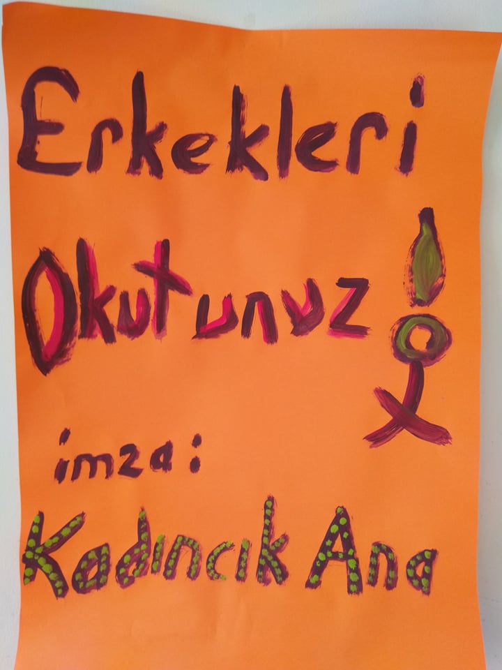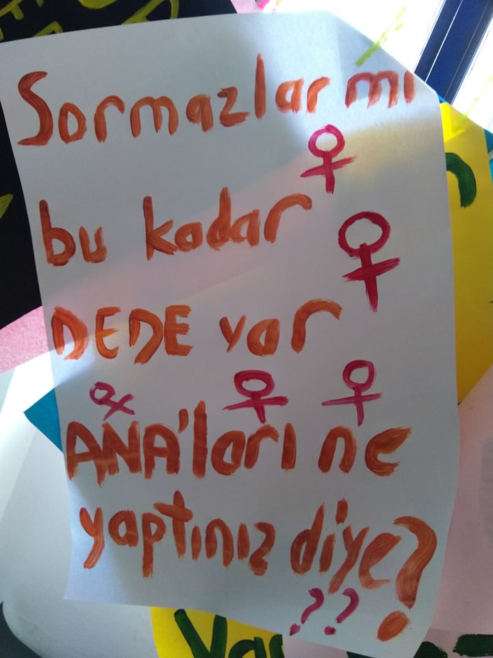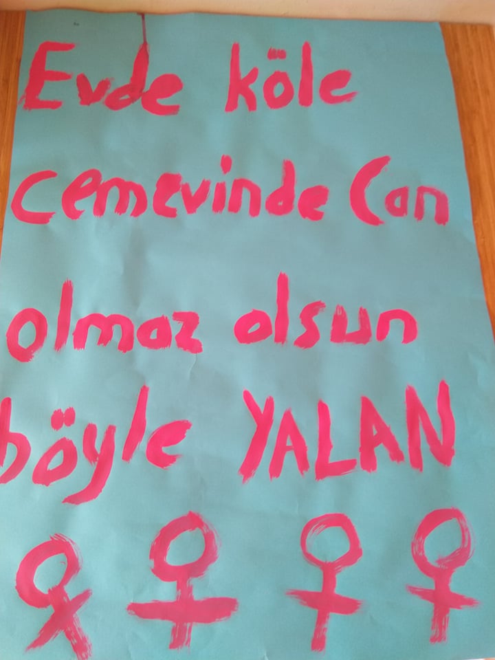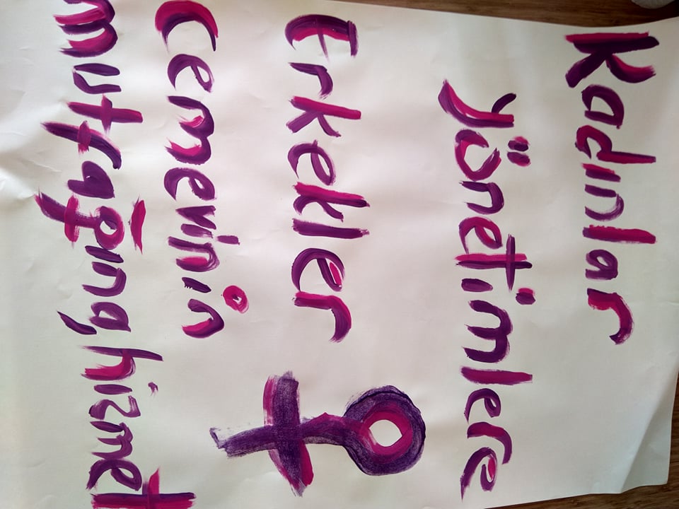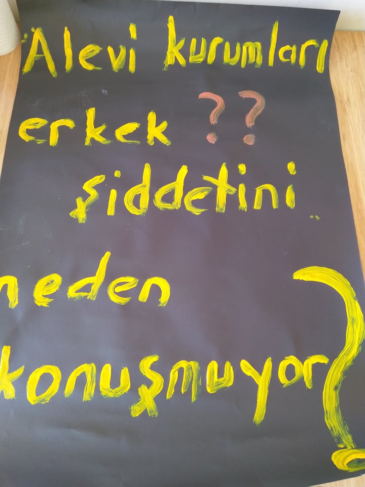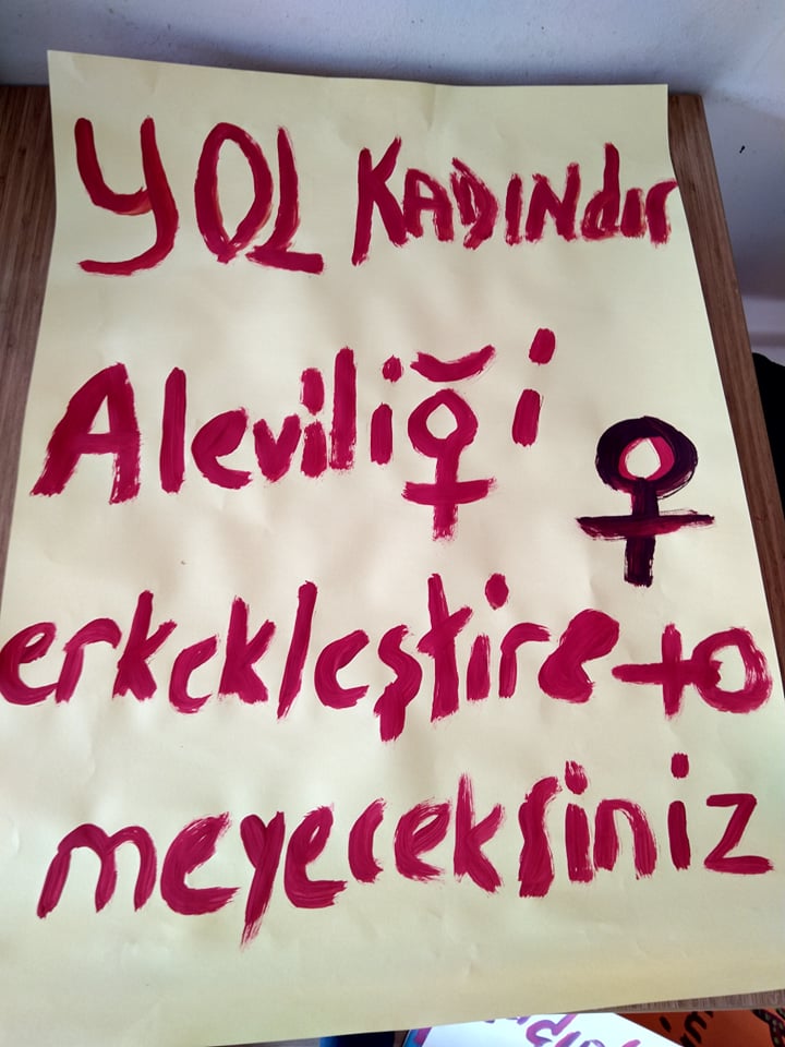 Alevi toplumu tarafından bilinen, mücadele için sıkça kullanılan kimi sloganları da kadınlar açısından uyarlayarak yazdık dövizlerimize. Çünkü kadın erkek eşitliği Alevilerin dediği gibi “Bizde eşitlik” var söyleminin tam tersi. Hayır. Bizde çok derinleştirilmiş, üstelik hakkında yeni yeni konuşulan derin bir eşitsizlik var. Alevilerde eşitsizliğin olduğunu, Alevilerin kadıncıl eşitlikçi inançlarından uzaklaştıklarını ve Aleviliği erkekleştirmeye çalıştıklarını, bunu da Alevi erkeklerin bilerek yaptıklarını göstermek için bu sözleri kullandık.