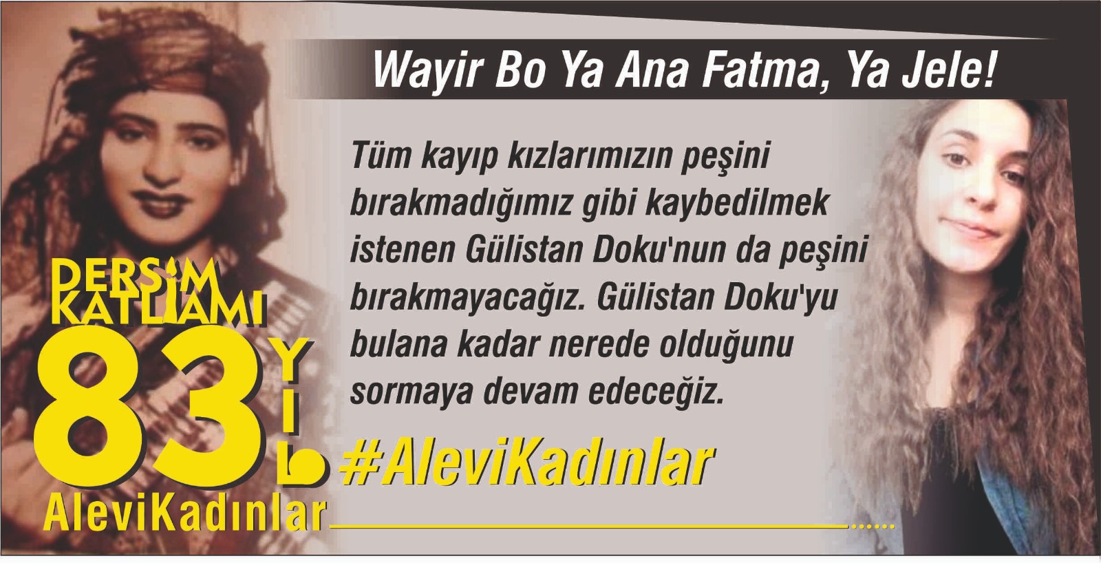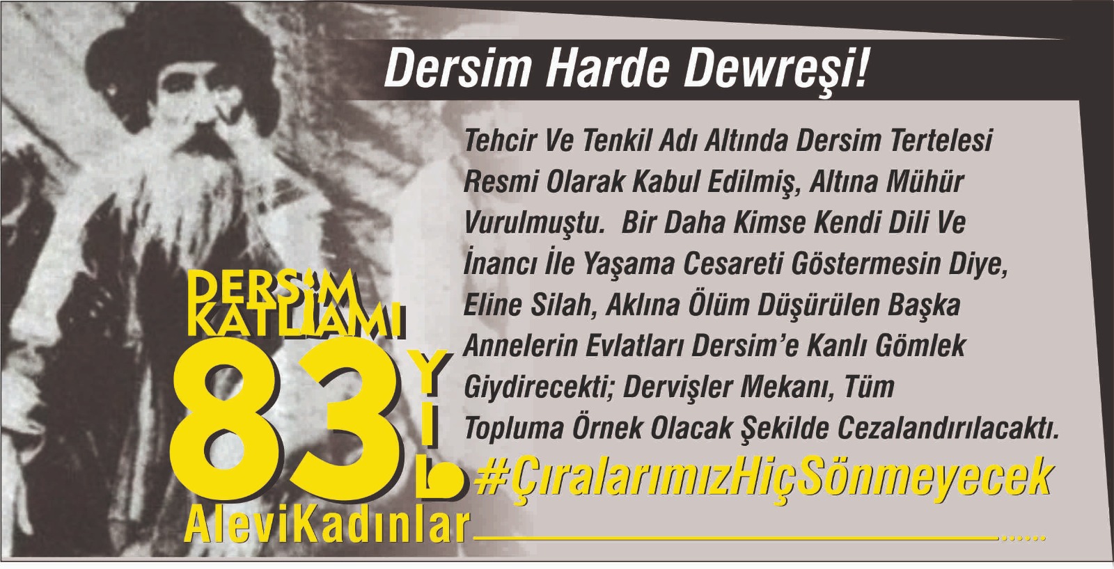 Biz Alevi Kadınlar da 83. yılında zalimi klamlarıyla yenenleri anıyoruz. 83. yılında da klamları söylemeye devam ediyoruz. Her inkârın bir toplu mezar olduğunu bilerek inkâr edilen tüm katliamlarla yüzleşmeye davet ediyoruz. Dersim Tertelesin’de kaybettiğimiz çocukları, kadınları ve cümle canı saygı ile anıyoruz. Bir kez daha, 83. yılında da her noktasında inancımızın yaşadığı Dersim doğasına sahip çıkıp niyaz edeceğimizin sözünü veriyoruz.