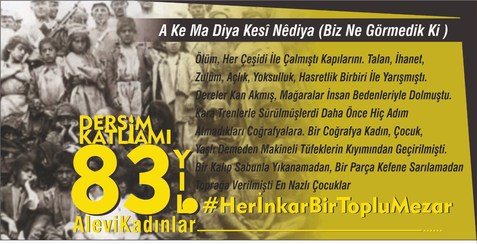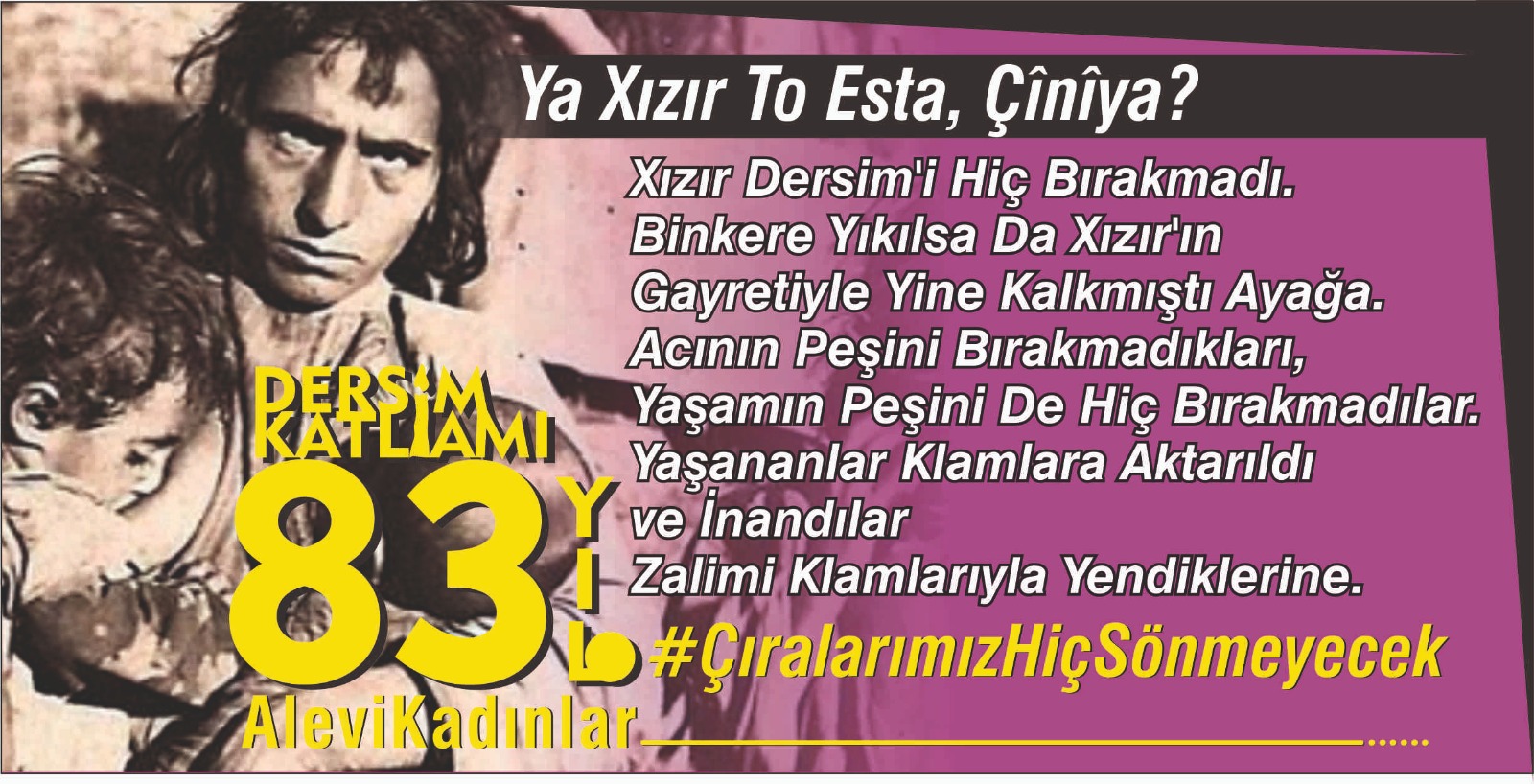 O günlerden sağ çıkanlar, o günleri “A ke ma diya kesî nêdiya” (biz ne görmedik ki ) diye anlatmaya başlıyordu. Ölüm, her çeşidi ile çalmıştı kapılarını. Talan, ihanet, zulüm, açlık, yoksulluk, hasretlik birbiri ile yarışmıştı. Dereler kan akmış, mağaralar insan bedenleriyle dolmuştu. Kara trenlerle sürülmüşlerdi daha önce hiç adım atmadıkları coğrafyalara. Bir coğrafya kadın, çocuk, yaşlı demeden makineli tüfeklerin kıyımından geçirilmişti. Bir kalıp sabunla yıkanamadan, bir parça kefene sarılamadan toprağa verilmişti en nazlı çocuklar. Dardaydı Dersim, çağıracağı Xızır’dı:”Ya Xızır to esta, çînîya?”