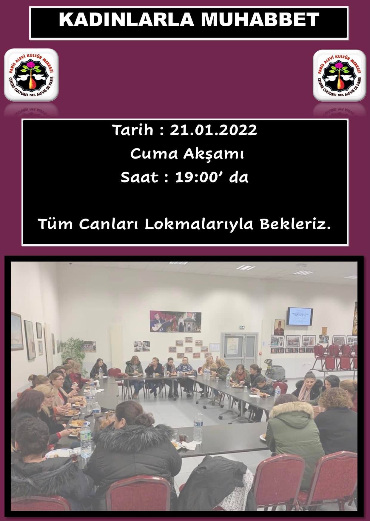 “21.01.2022 Cuma akşamı saat 19:00’da, Paris Alevi Kültür Merkezimizde, kadınlara yönelik bir muhabbet düzenlenecektir. Katılmak isteyen kadın canlarımızı lokmalarıyla bekleriz. Lütfen pandemi kurallarına muhakkak uyalım ve sağlık karnesini (pass sanitaire) yanımızda bulunduralım.”