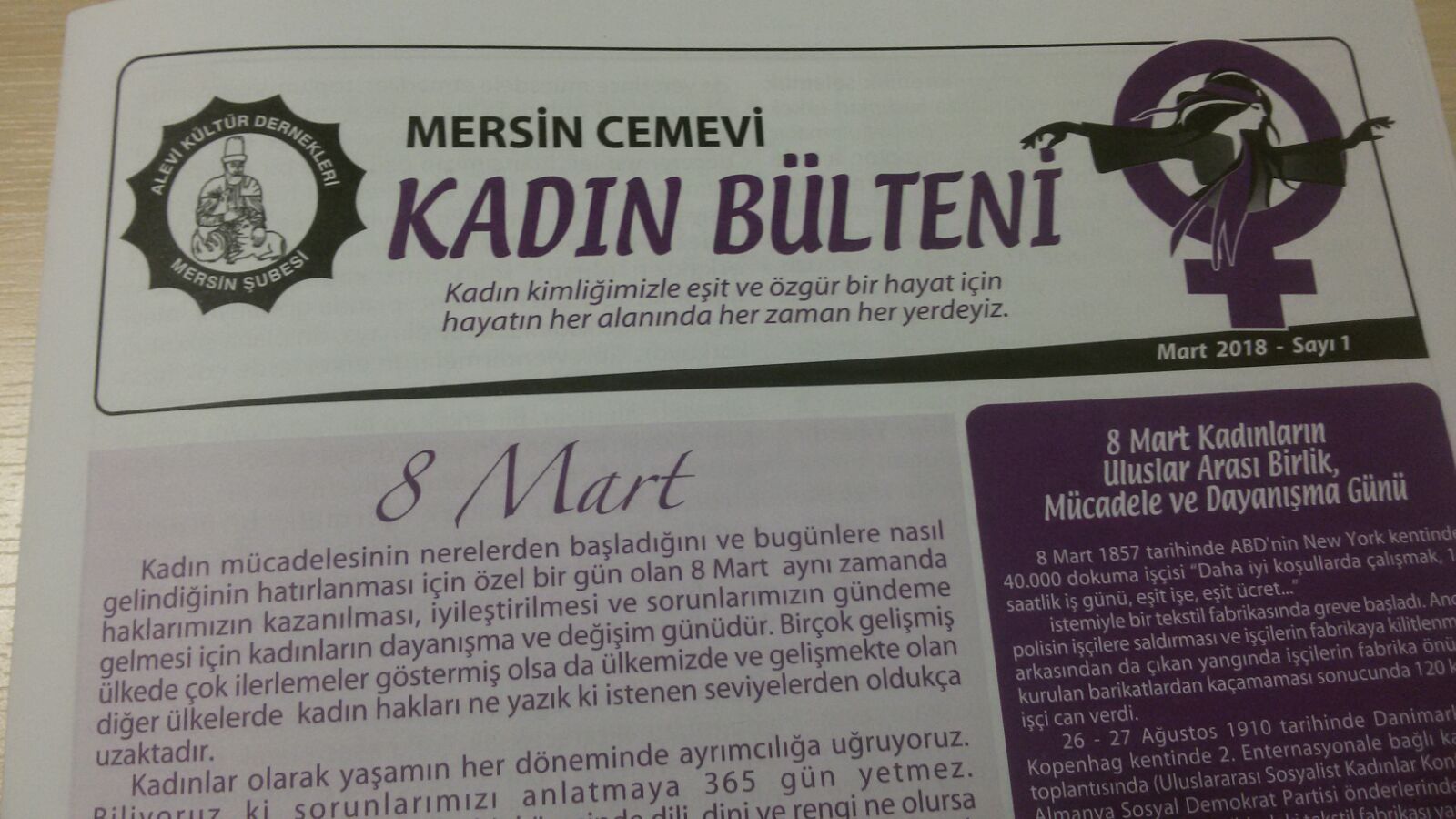 Mersin Cemevi Kadın Kolları kadın bülteni çıkardı. “Kadın kimliğimizle eşit ve özgür bir hayat için hayatın her alanında her zaman her yerdeyiz” mottosuyla çıkan bülten bir ilk olma özelliğini taşıyor.