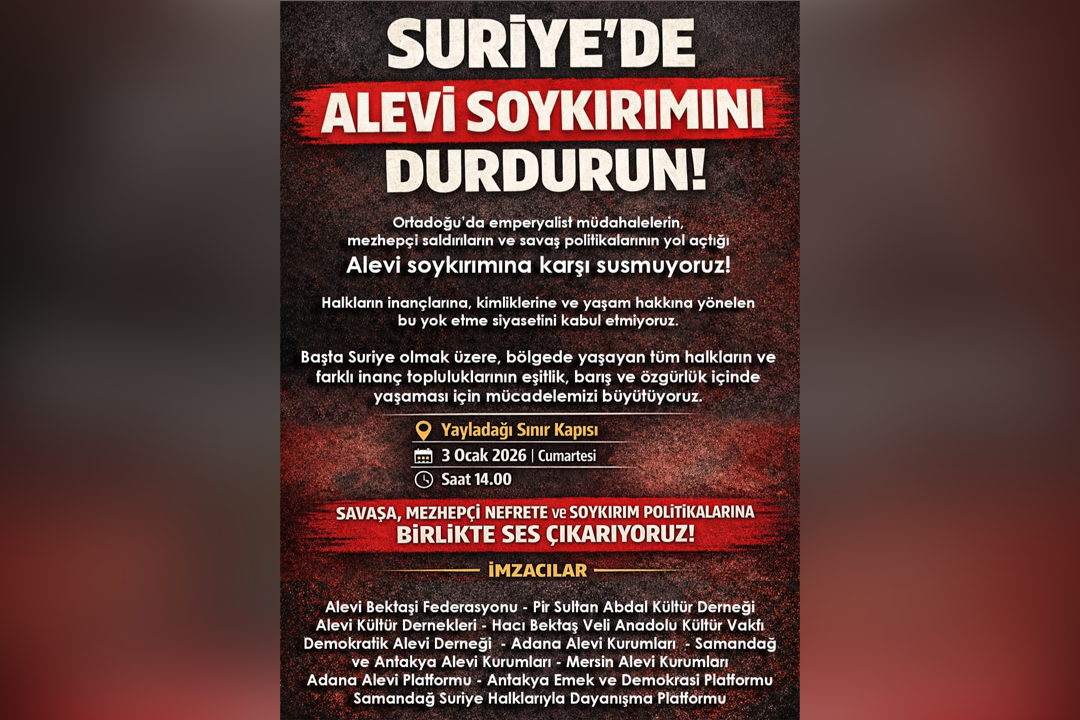 3 Ocak Cumartesi günü saat 14.00’te Yayladağı Sınır Kapısı’nda gerçekleştirilecek buluşmada, Suriye’de Alevilere yönelik saldırıların durdurulması, mezhepçi nefretin son bulması ve uluslararası kamuoyunun harekete geçmesi çağrısı yapılacak. Etkinlikte, savaşa, mezhepçi şiddete ve soykırım politikalarına karşı birlikte mücadele vurgusu öne çıkacak.