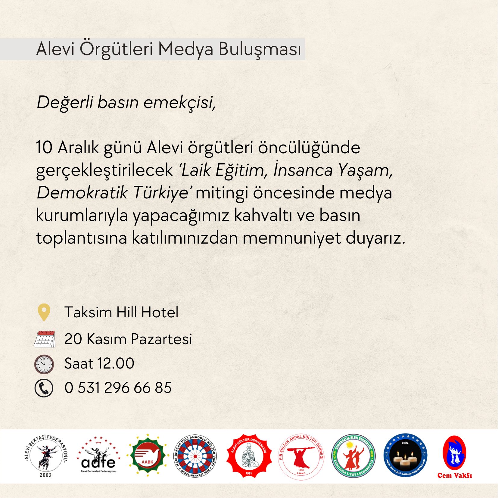 Alevi örgütleri, miting öncesinde 20 Kasım Pazartesi günü saat 12.00’de Taksim Hill Hotel’de medya kurumlarıyla kahvaltılı basın toplantısı yapacak. Toplantıya tüm basın emekçileri davet edildi.