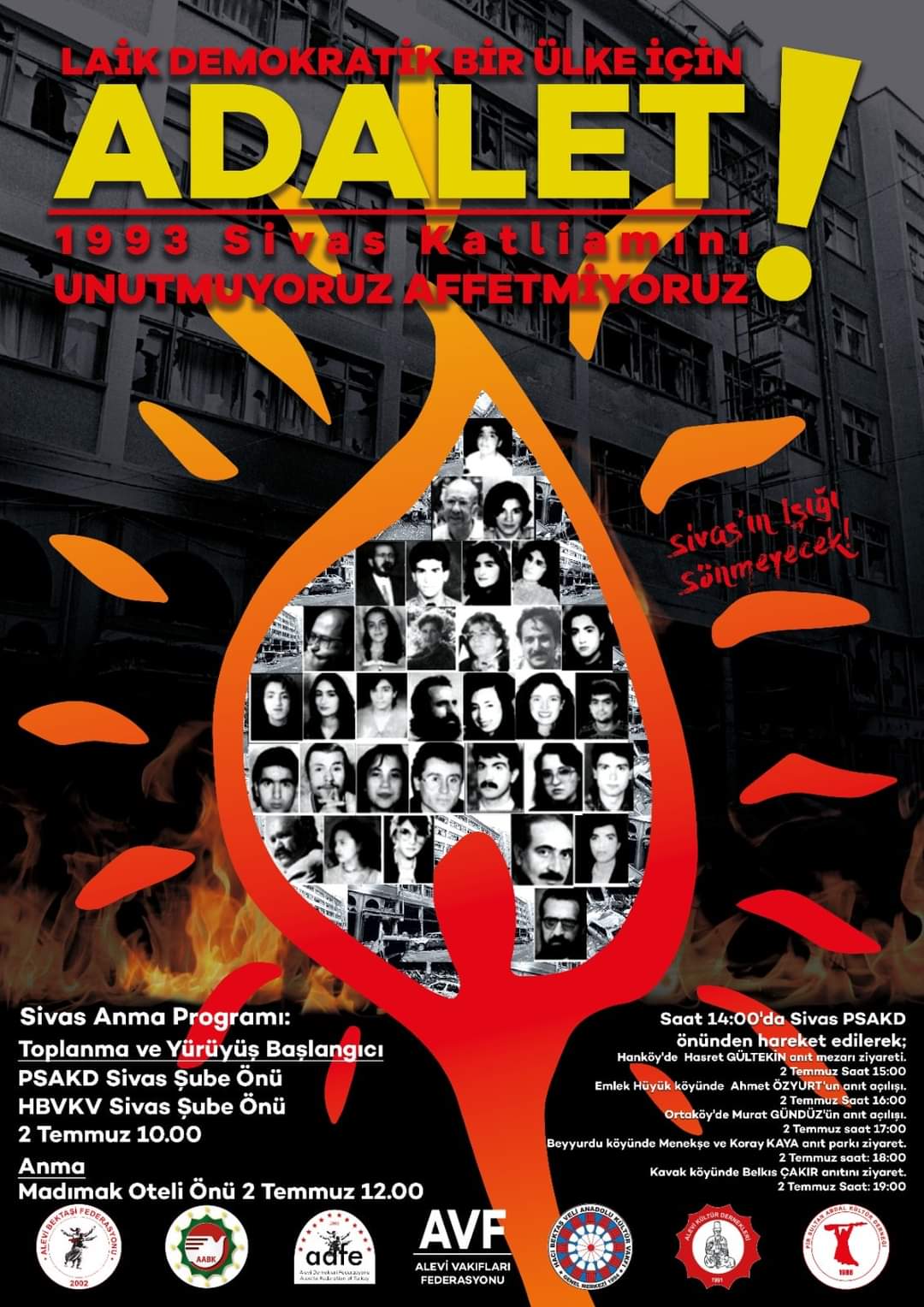 ‘Laik, demokratik bir ülke için adalet!’, ‘1993 Sivas Katliamı’nı unutmuyoruz, affetmiyoruz’, ‘Sivas’ın ışığı sönmeyecek’ diyen Alevi Bektaşi Federasyonu (ABF), Avrupa Alevi Birlikleri Konfederasyonu (AABK), Alevi Vakıfları Federasyonu (AVF), Alevi Dernekleri Federasyonu (ADFE), Hacı Bektaş Veli Anadolu Kültür Vakfı (HBVAKV), Alevi Kültür Dernekleri (AKD), Pir Sultan Abdal Kültür Derneği (PSAKD) Sivas Katliamı’nın 28. Yılında katliamda hayatını kaybedenleri anmak için katliamın yapıldığı Madımak Oteli önünde ve Sivas’ın çeşitli yerlerinde anma yapacak.