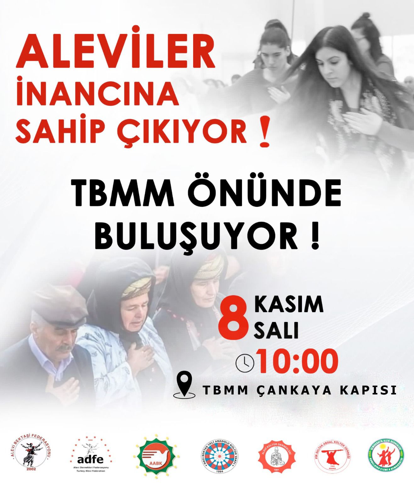 Alevi Bektaşi Federasyonu (ABF), Avrupa Alevi Birlikleri Konfederasyonu (AABK), Alevi Dernekleri Federasyonu (ADFE), Alevi Vakıflar Federasyonu (AVF), Hacı Bektaş Veli Anadolu Kültür Vakfı (HBVAVK), Alevi Kültür Dernekleri (AKD), Pir Sultan Abdal Kültür Derneği (PSAKD) ile Demokratik Alevi Dernekleri (DAD) 8 Kasım Salı günü saat 10.00’da TBMM Çankaya kapısı önüne çağrıda bulundu.
