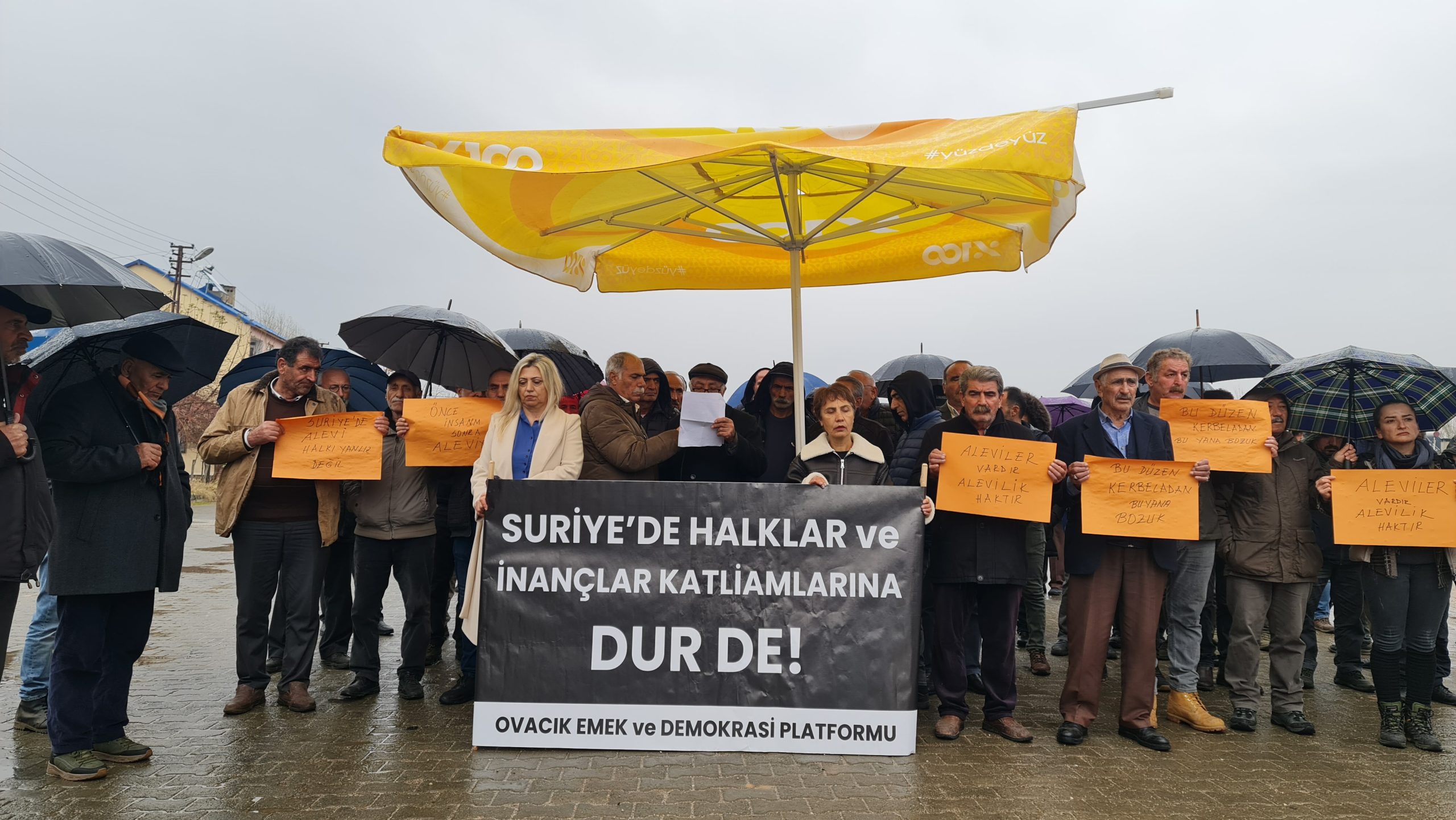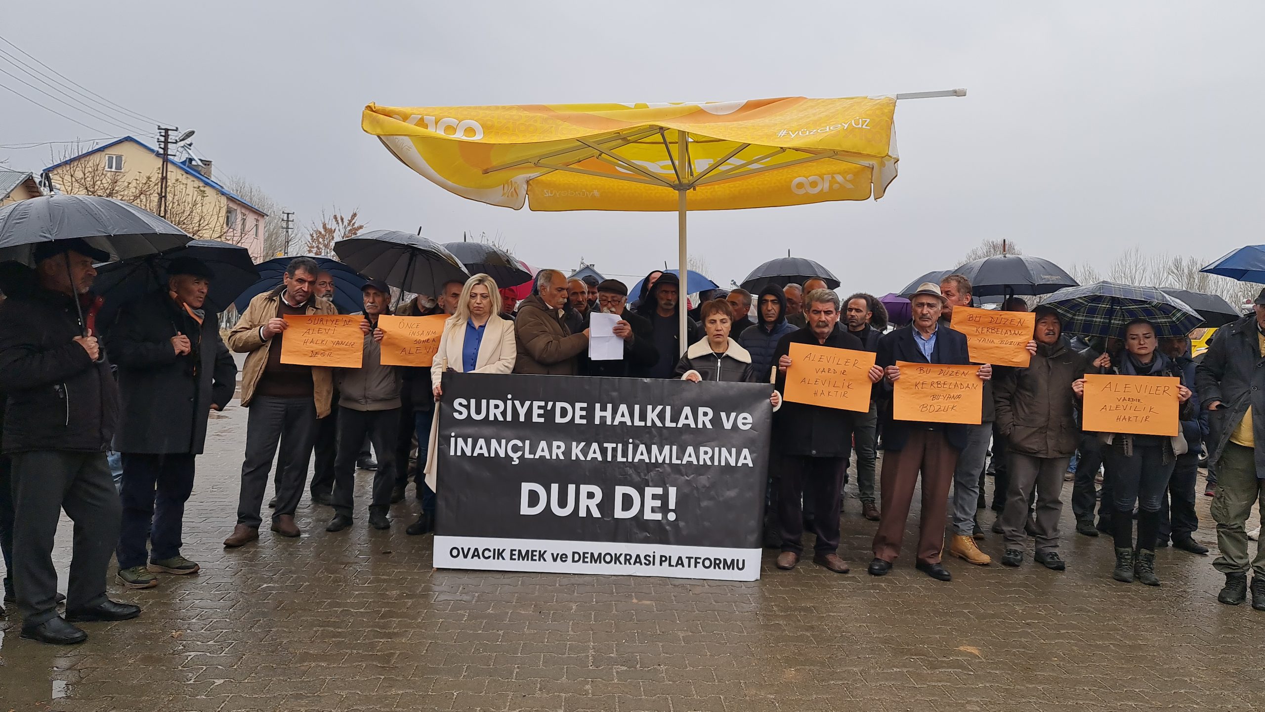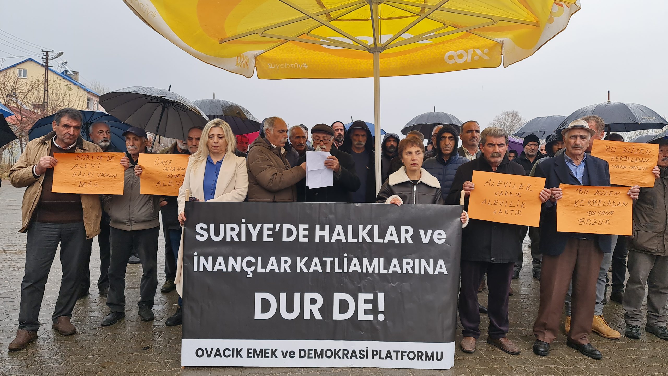Ovacık Emek ve Demokrasi Platformu, Suriye’deki Alevi Katliamı’na ilişkin basın açıklaması yaptı. ‘Suriye’de halklar ve inançlar katliamlarına dur de’ pankartının açıldığı açıklamada basın metnini Orhan Özkanlı, okudu.