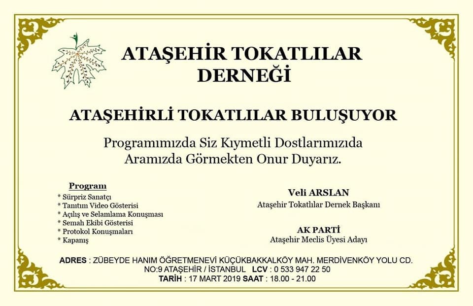 Ataşehir Tokatlılar Derneği Başkanı ve AKP Ataşehir Meclis Üyesi adayı Veli Arslan, 17 Mart’a yapacağı tanıtım toplantısının davetiyelerinde ‘Semah Ekibi Gösterisi’ yazılmasına Alevi kurumlarından tepki geldi.