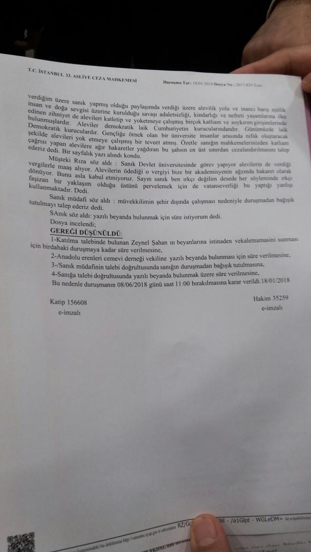 “Zaman zaman böyle Alevileri, ülkeyi karıştırma adına bu tür söylemlerde bulunup yazılar yazıyorlar. Akademisyene yakışmayacak bir söylem ve davranıştır. Bunun karşısındayız. Toplumumuzun da bu konuda duyarlı olması ve bu tür davalarda yoğun katılım göstermesi gerekiyor. Duyarsızlık bizi üzüyor. Kurumlarımızın da bu konuda eksikliği var. Yeteri kadar haber yayamadık belki. Biz de kendimizi sorgulamalıyız. Herkesin duyarlılık göstermesini bekliyoruz. Bu ilk değil, son da olmayacak. Asırlardır Alevi inancına yönelik, Alevi toplumuna yönelik bu tür saldırılar oluyor. Bunun karşısında durmak gerekiyor. Kurumlar olarak bunun takipçisiyiz, takip edeceğiz. En ağır şekilde ceza almasını talep edeceğiz.”