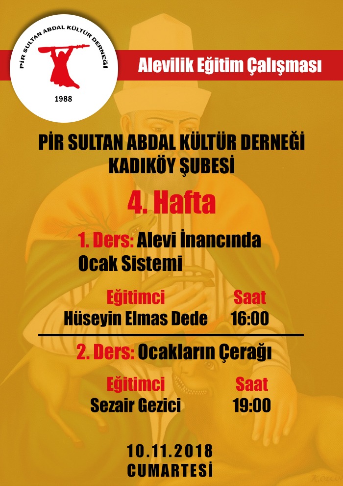 Pir Sultan Abdal Kültür Derneği Kadıköy Şubesi’nin Alevilik Eğitim Çalışması 4. Hafta da devam edecek. 10 Kasım Cumartesi günü saat 19.00’da 1. ders olarak Alevi inancında ocak sistemi konusu Hüseyin Elmas dede tarafından verilecek.