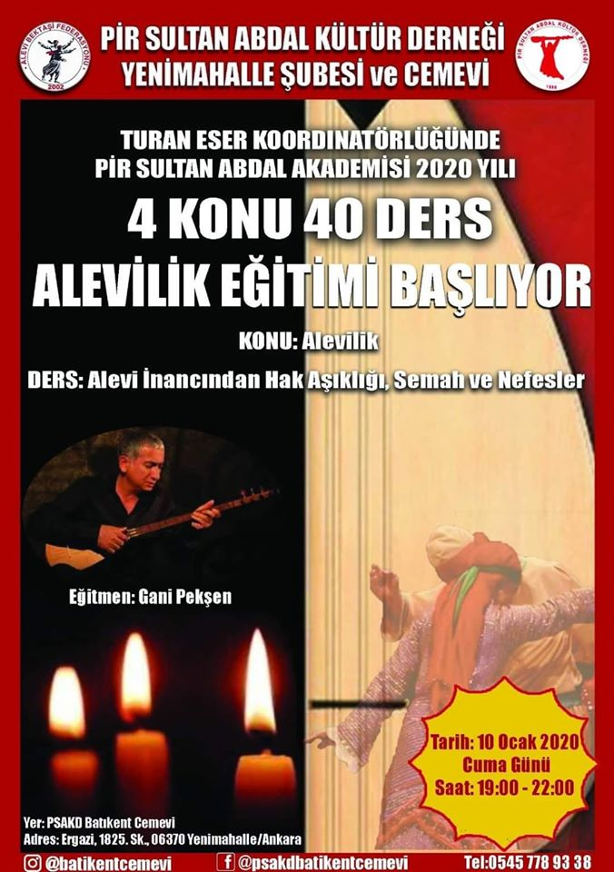 Pir Sultan Abdal Kültür Derneği Yenimahalle Cemevi öncülüğünde Pir Sultan Abdal Akademisi başlıyor. Alevilik eğitiminin koordinatörlüğünü Turan Eser yapıyor. 4 konu 40 ders ile başlayacak eğitimde ilk olarak Gani Pekşen, Alevi inancından hak aşıklığı, semah ve nefesler konusu anlatacak. Eğitim 10 Ocak Cuma günü saat: 19.00 ile 22.00 saatleri arasında verilecek.